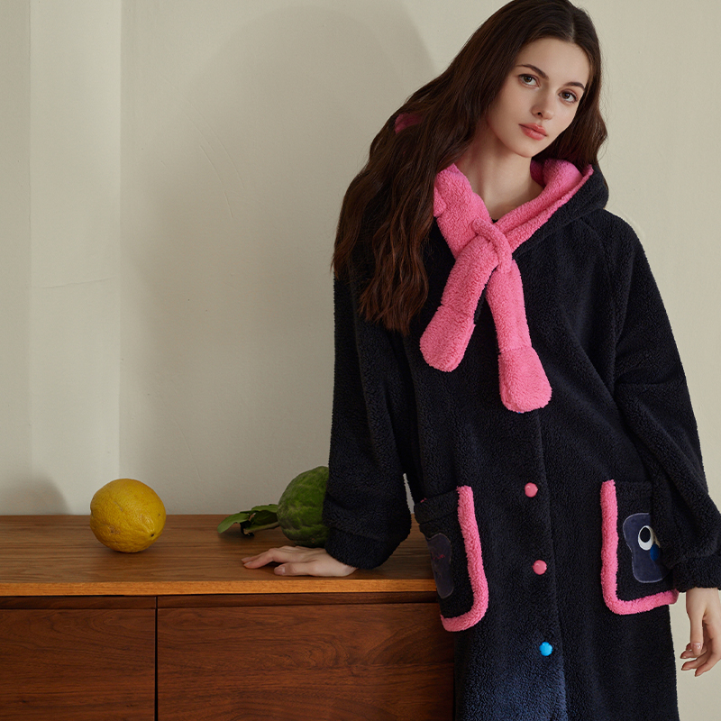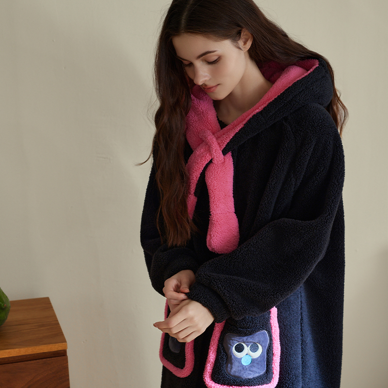 品册 可爱连帽睡袍加绒加厚保暖家居服浴袍 秋冬珊瑚绒睡衣女长款