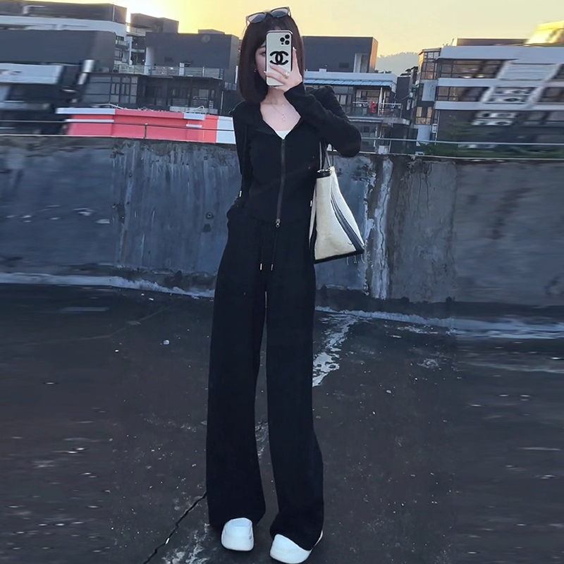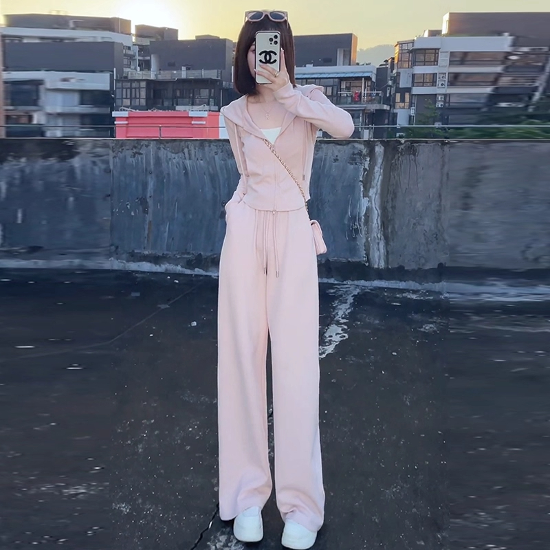 超火ootd穿搭一整套高级感 2025新款 粉色运动休闲卫衣套装 女早秋季
