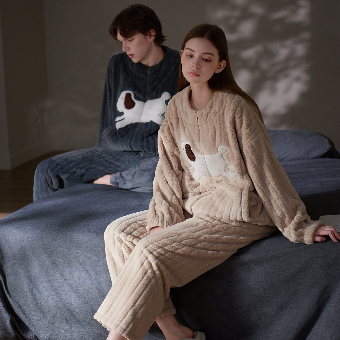 大码 春秋开衫 女士家居服 加厚珊瑚绒睡衣女冬法兰绒加绒套装 秋冬季