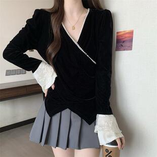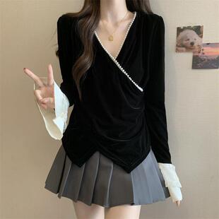 不规则打底衫 V领T恤女胖mm时尚 上衣1012z 金丝绒长袖 秋冬大码