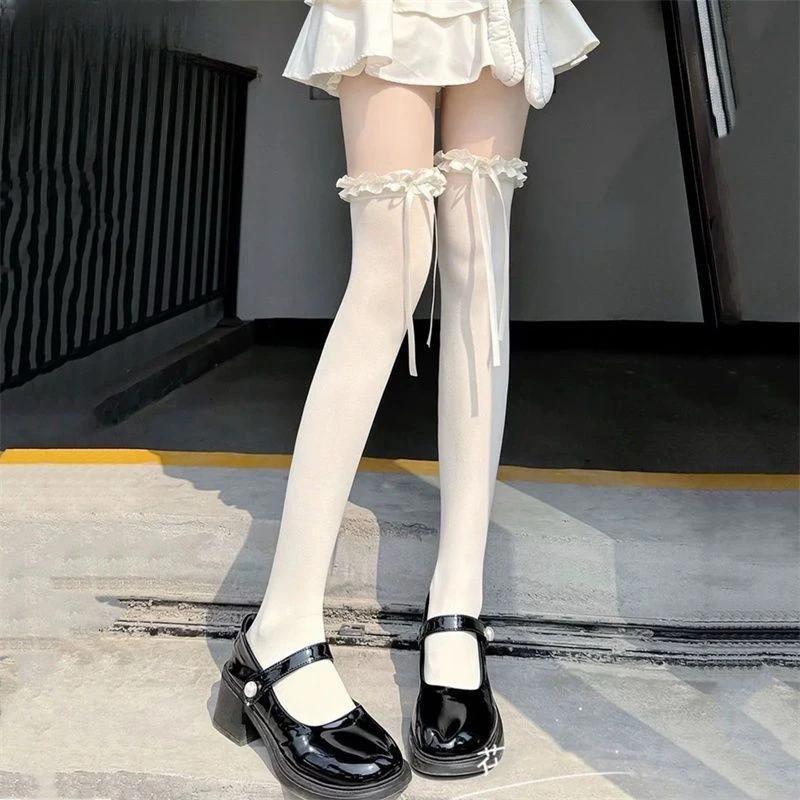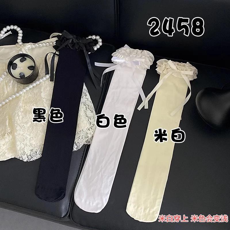 日系白色过膝袜jk夏季 防勾丝蝴蝶结蕾丝花边长筒Lolita丝袜子 薄款