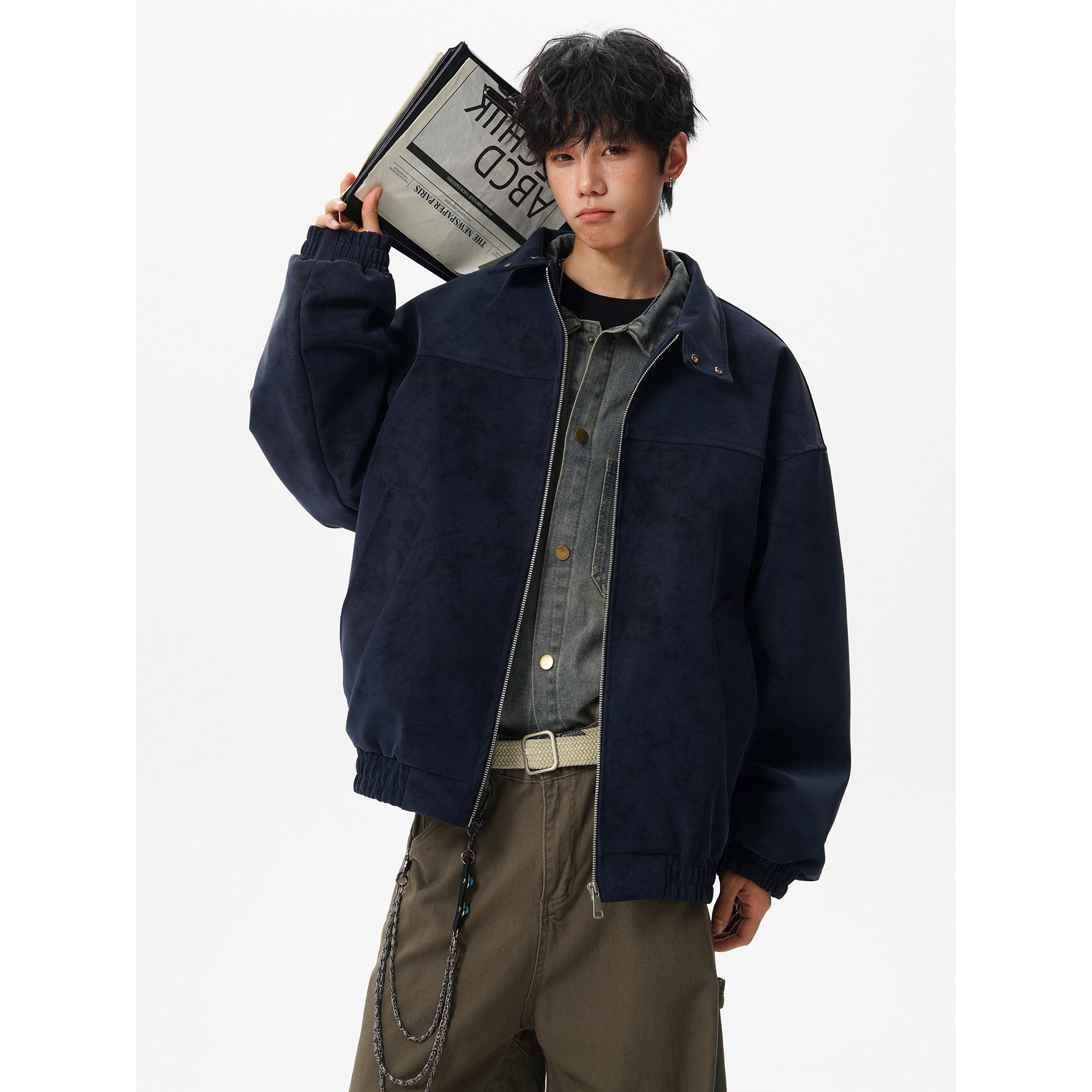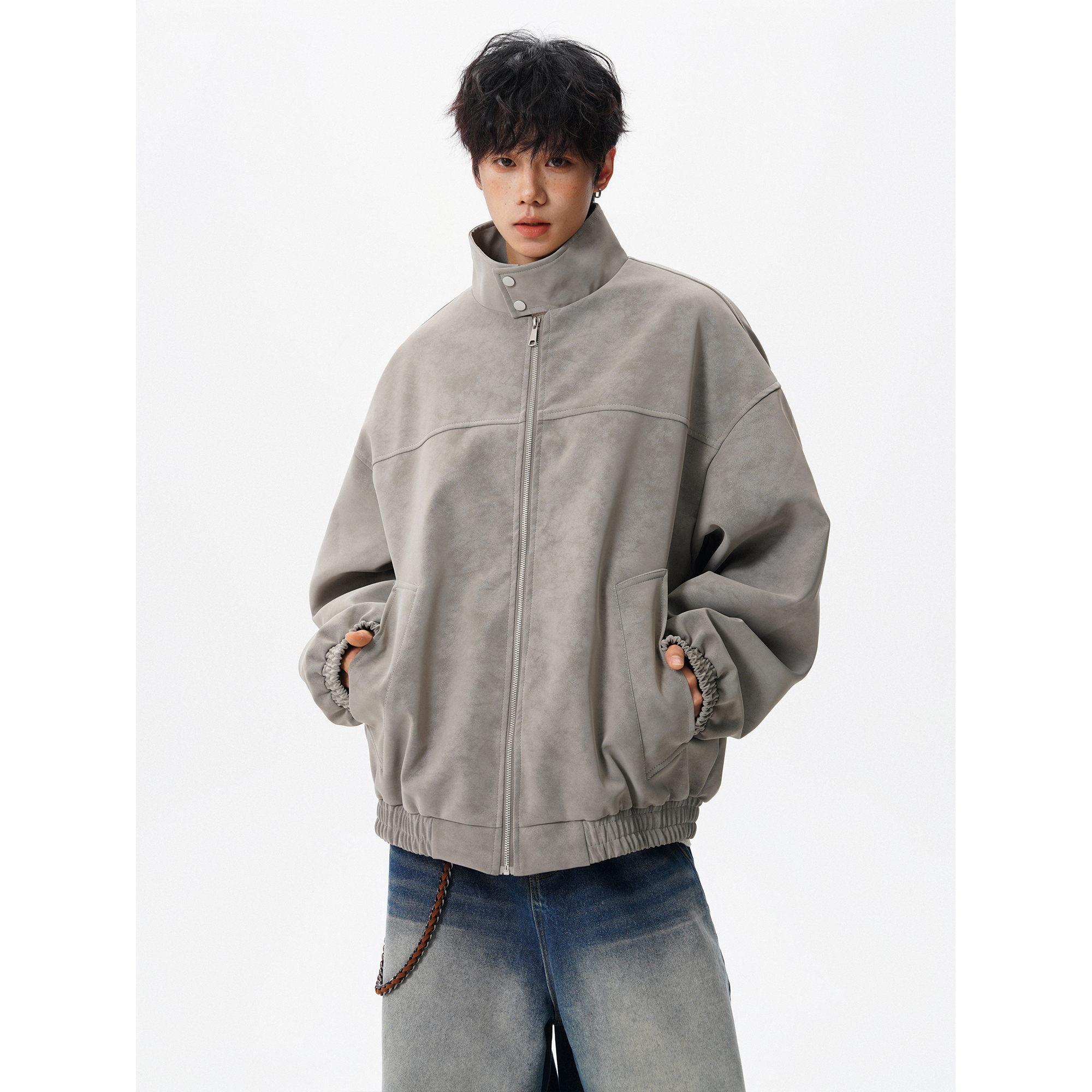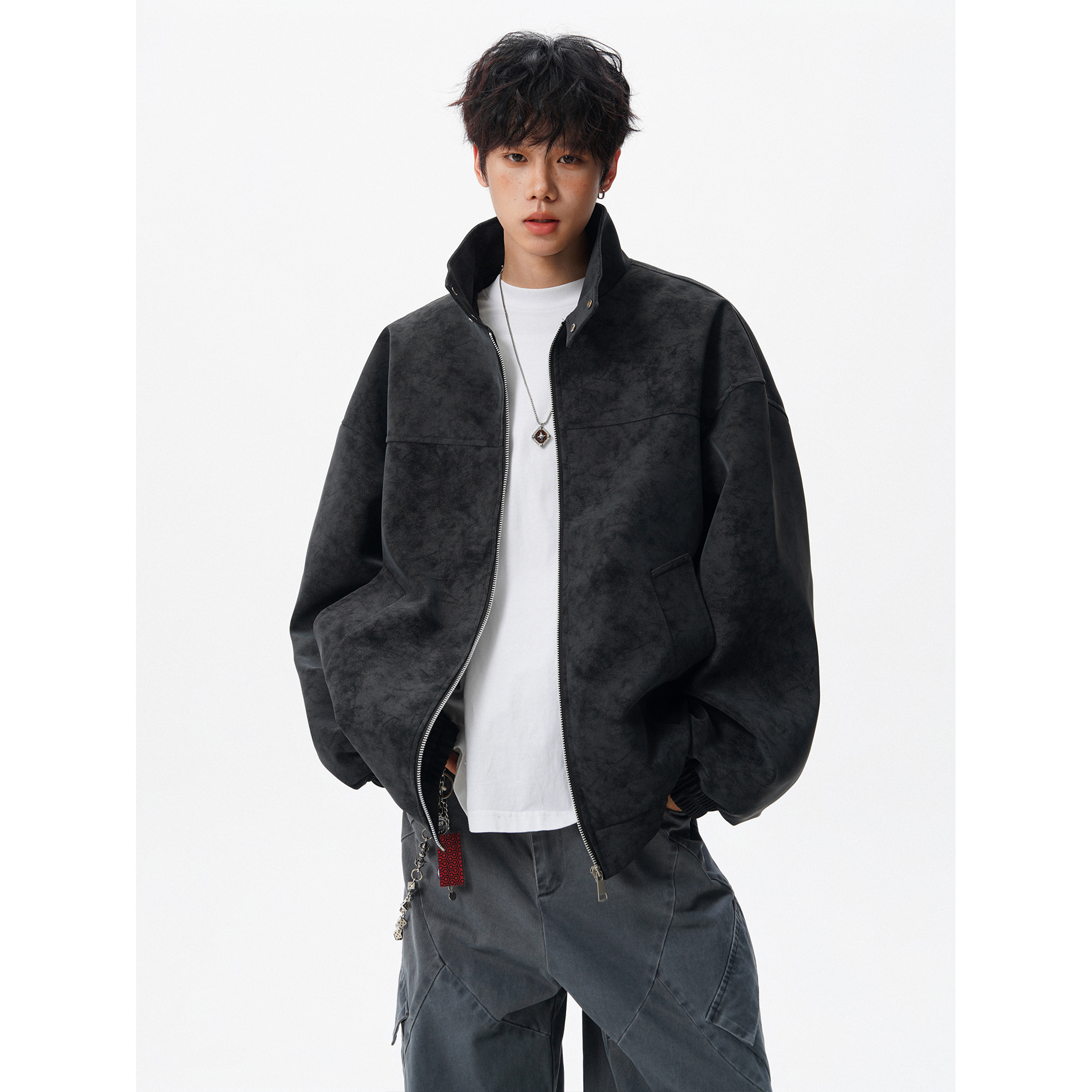 美式 重磅宽松休闲百搭情侣外套 cleanfit扎染PU皮立领夹克男生秋季