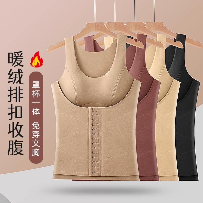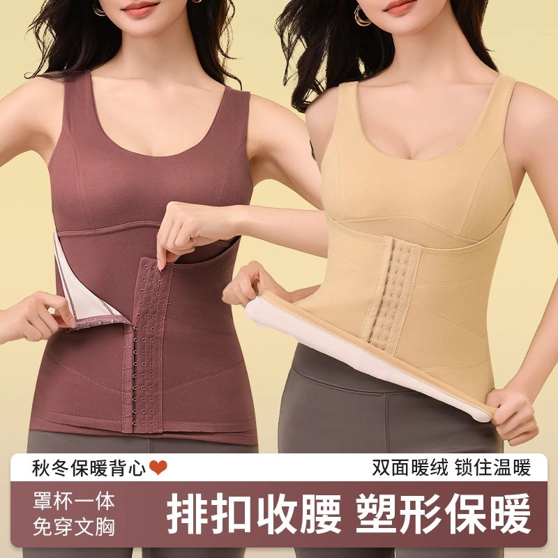 加绒加厚发热保暖内衣女塑形排扣收腰美体打底衫 自带胸垫马甲背心