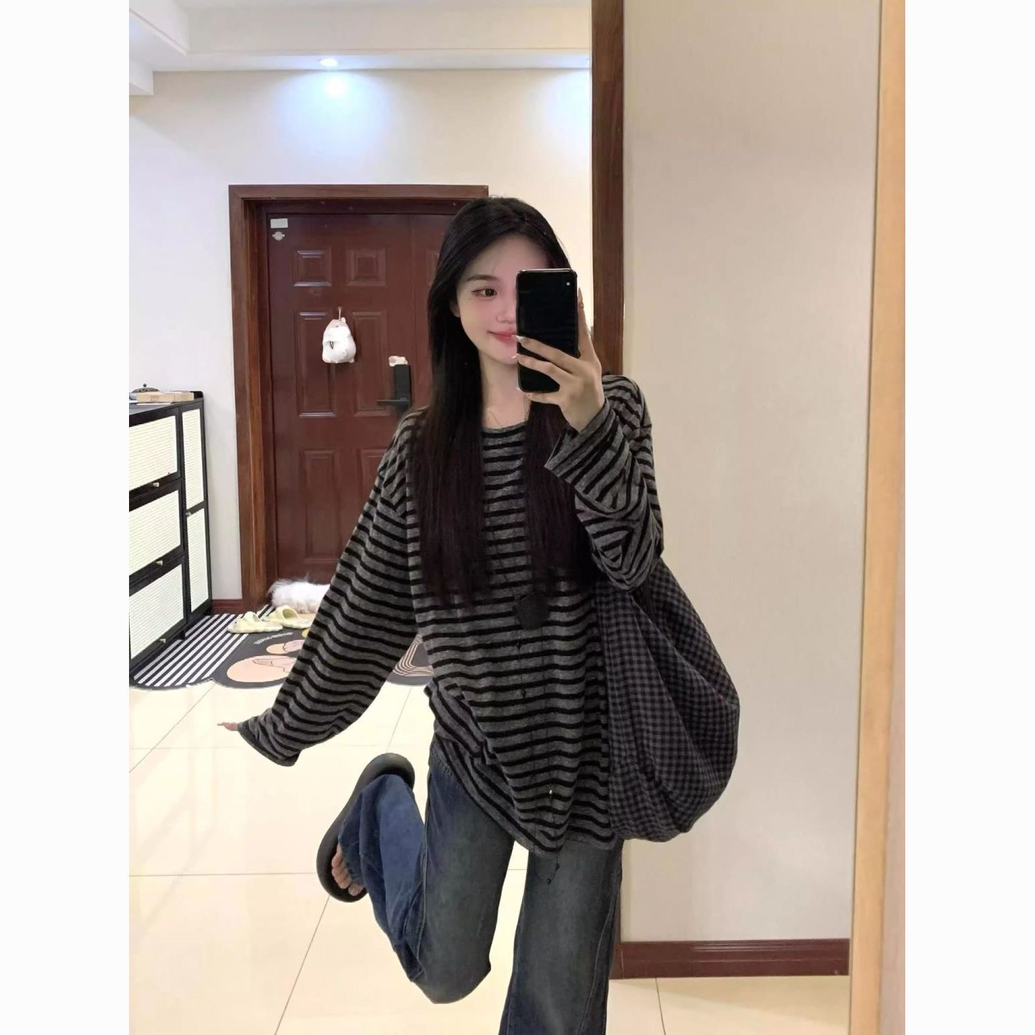 上衣女潮 条纹宽松显瘦长袖 韩系慵懒风撞色条纹长袖 t恤女秋冬新款