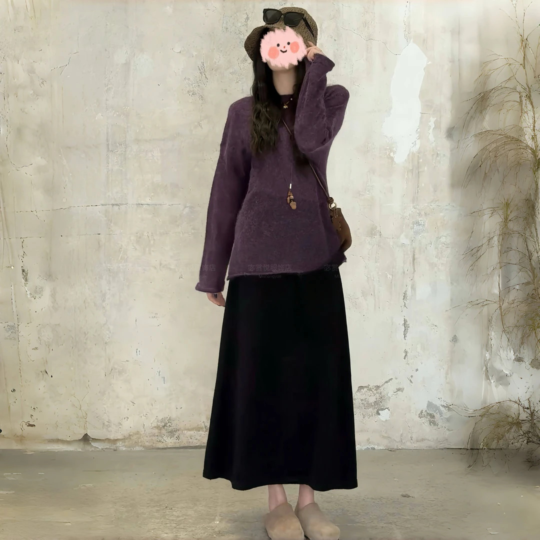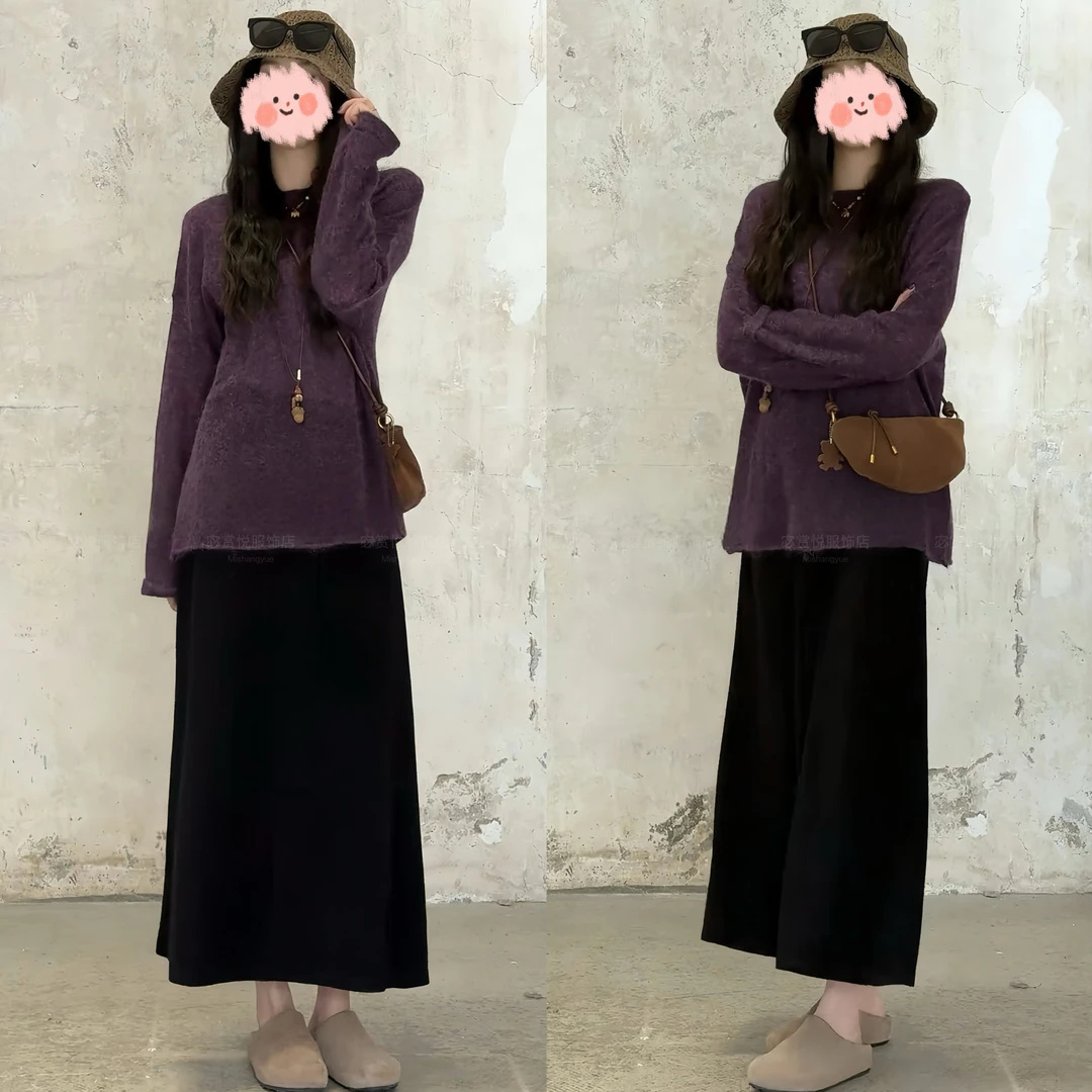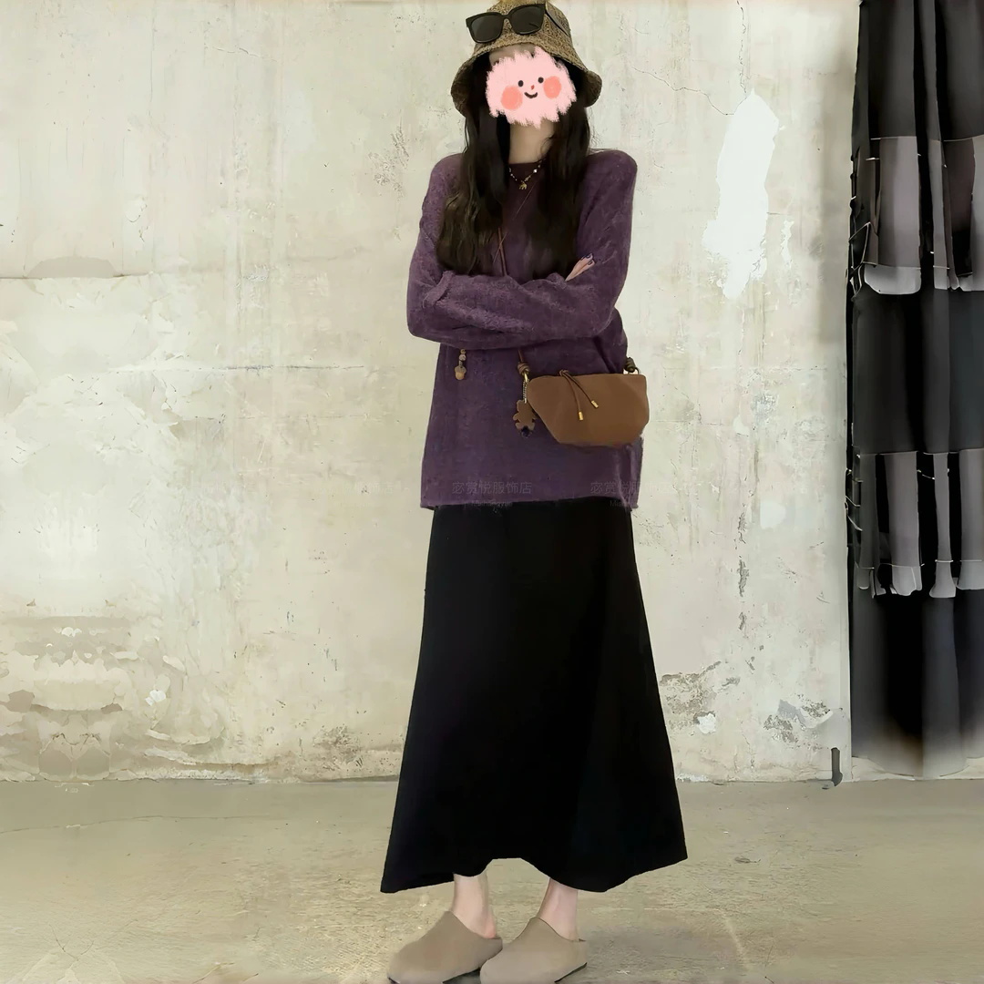 慵懒风套头紫色针织衫 紫色毛衣半身裙两件套 女2025圆领宽松中长款