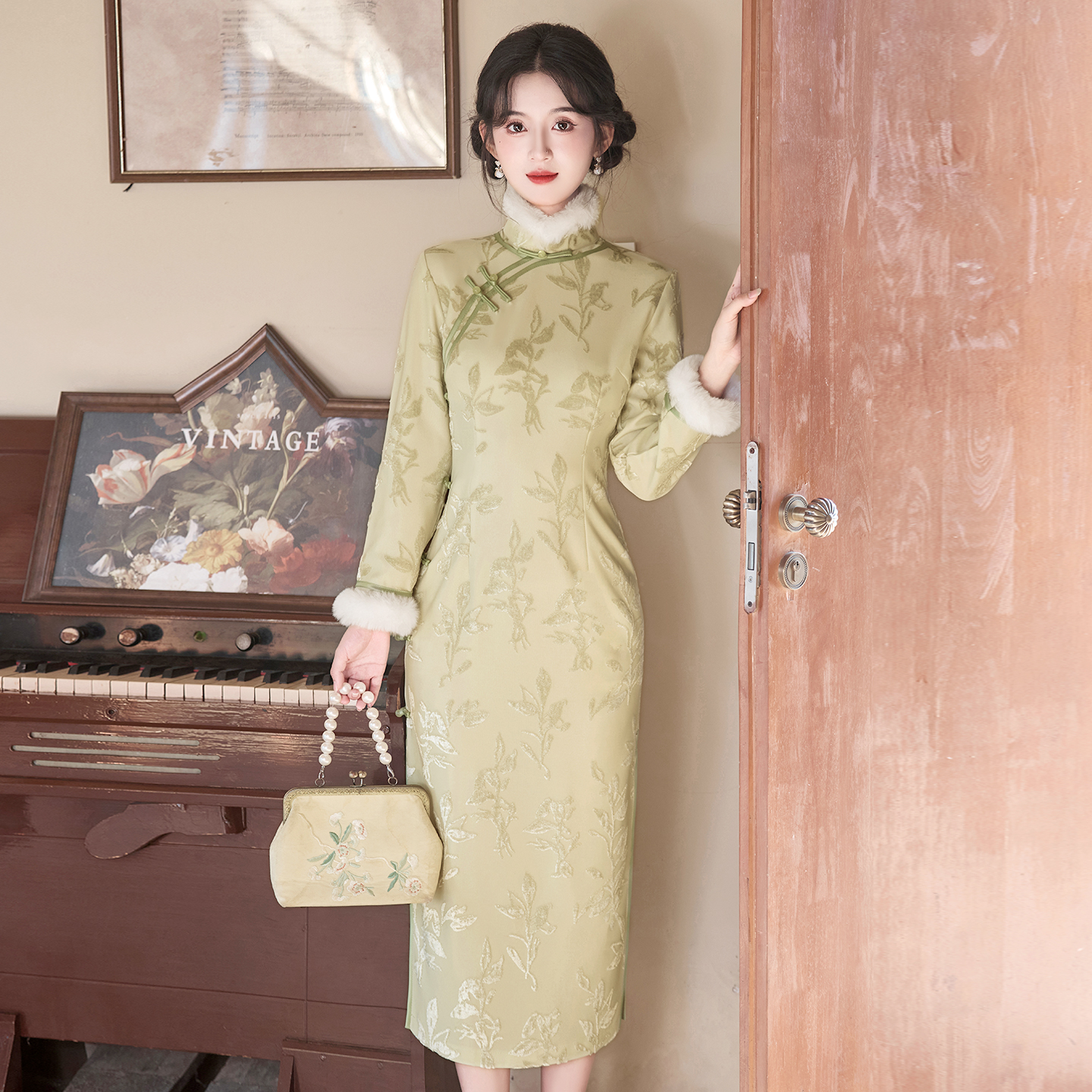 新中式 年会礼服改良旗袍 国风盘扣绿色丝绒连衣裙女2025年秋冬新款