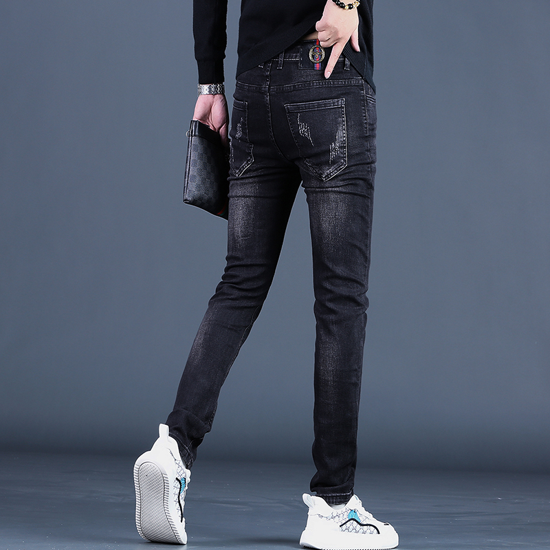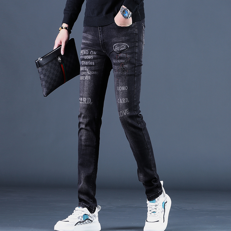 时尚 印花牛仔裤 男士 秋季 休闲潮牌黑色小脚裤 2025年新款 修身 子潮 款