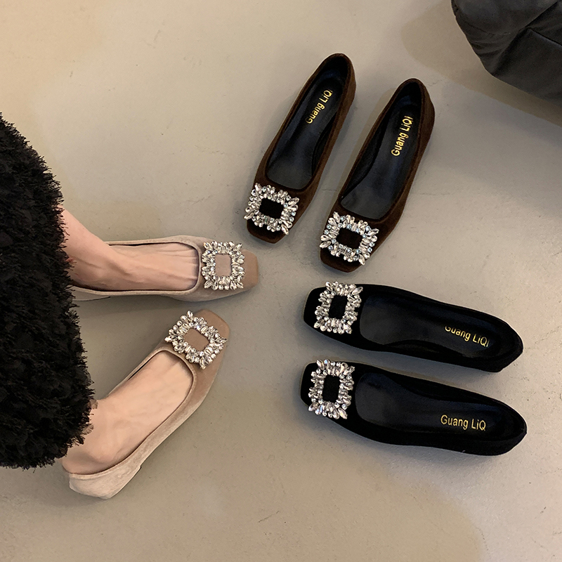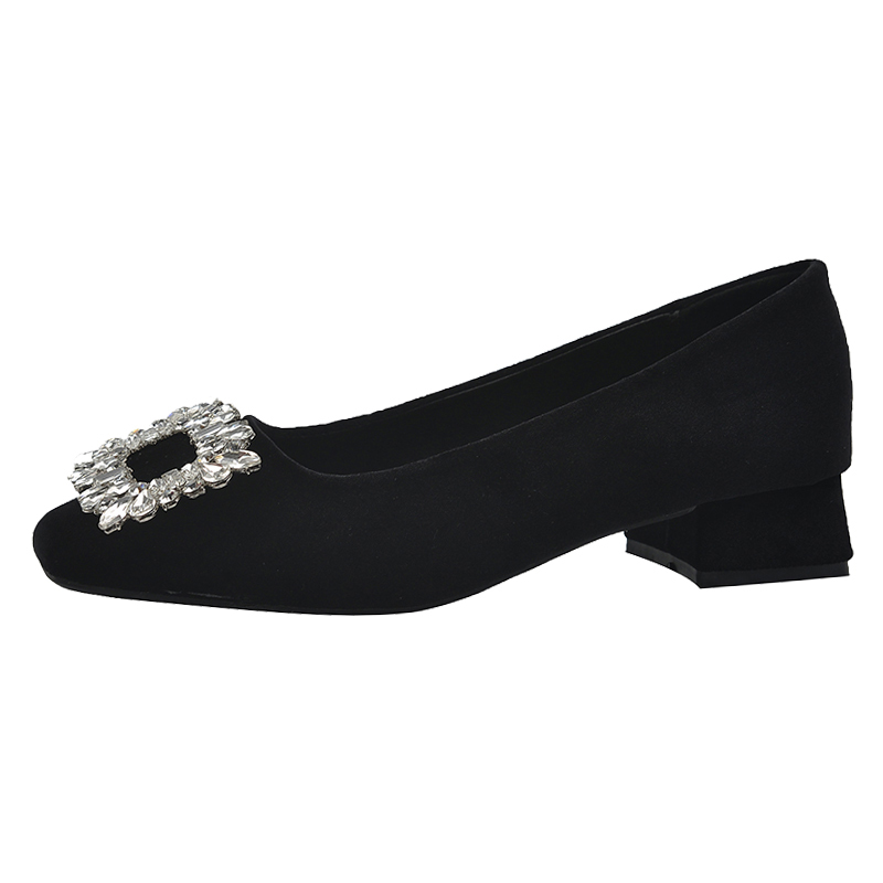 平底高跟鞋 浅口单鞋 方扣水钻粗跟中跟瓢鞋 秋冬绒面船鞋 女 2025新款