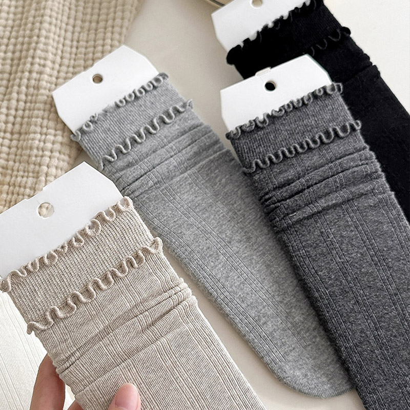 奶白色木耳花边堆堆袜子女秋冬纯棉miu系中筒松口月子长袜小皮鞋