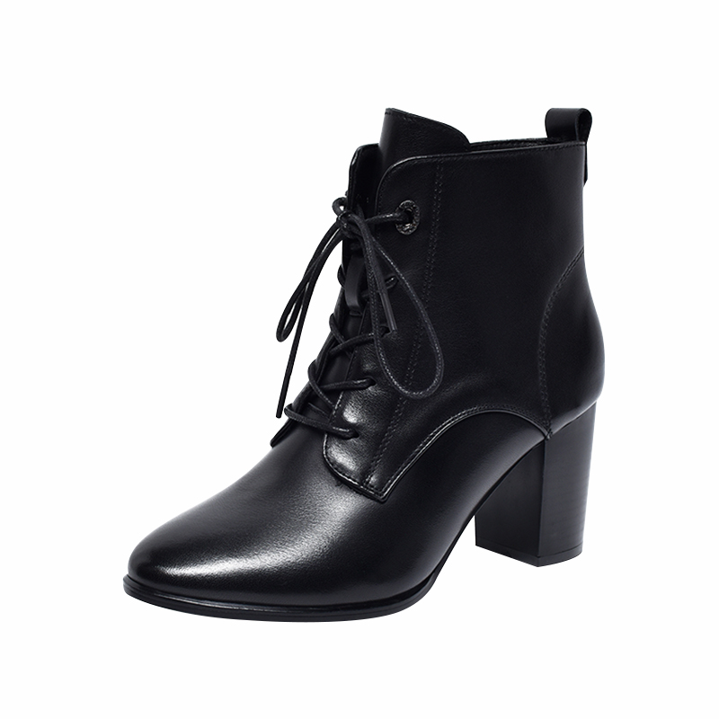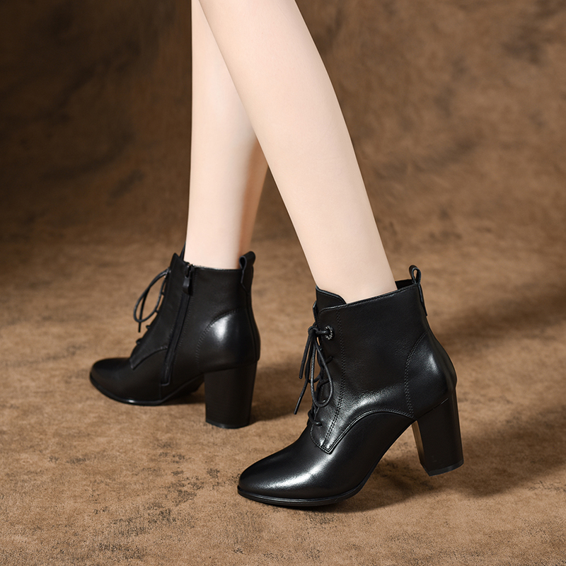 秋冬气质女靴子 短靴不累脚软皮真皮鞋 2025新款 女士系带粗跟高跟鞋