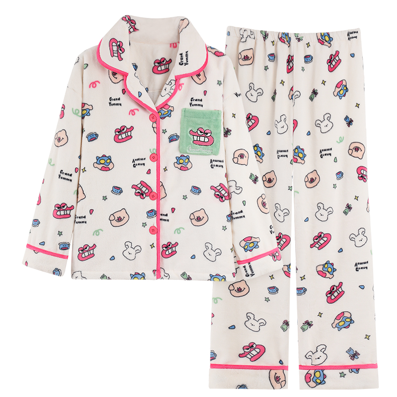 大码 春秋开衫 女士家居服 加厚珊瑚绒睡衣女冬法兰绒加绒套装 秋冬季