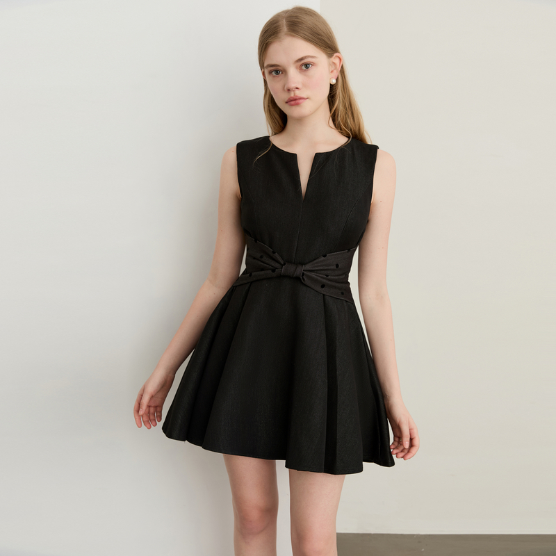 DPLAY2025秋季 黑色连衣裙女植绒波点蝴蝶结设计收腰裙子短裙 新款