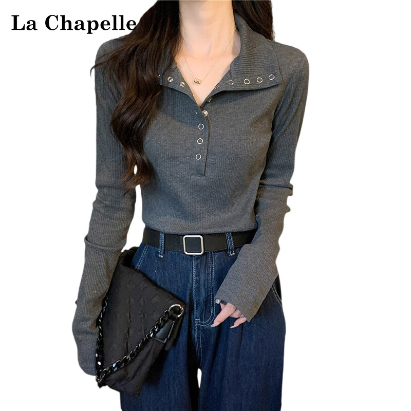 打底衫 修身 小香风内搭上衣 T恤女秋季 拉夏贝尔灰色亨利领针织长袖