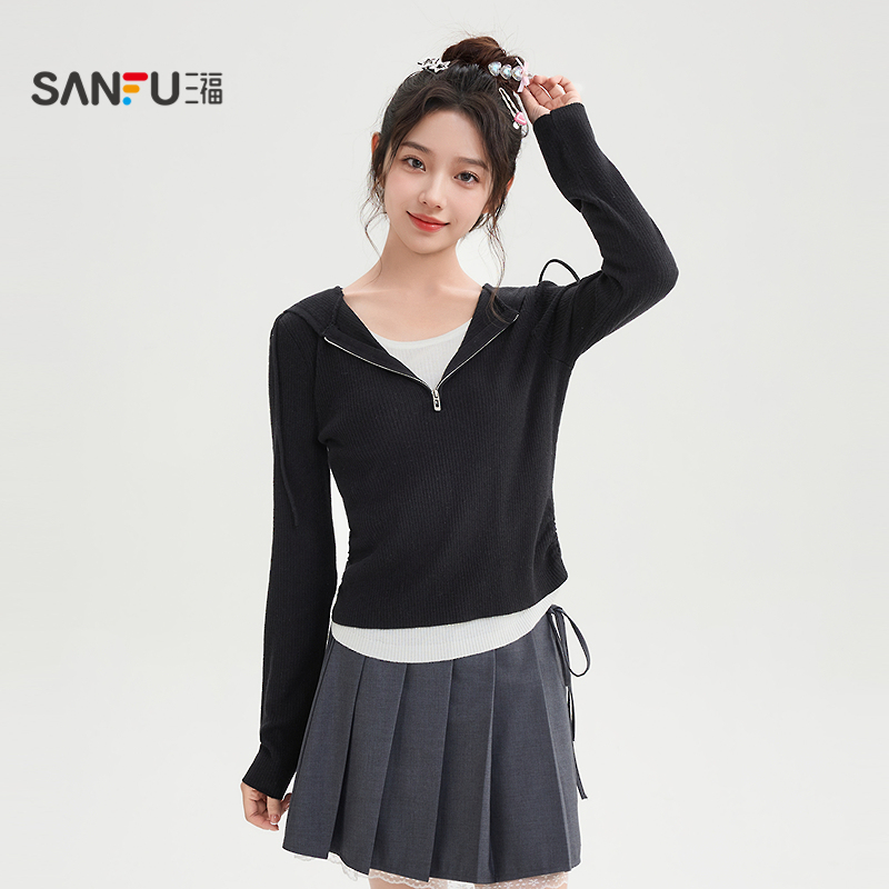 连帽上衣女装 修身 507473 小众设计感假两件针织衫 三福毛衣2025秋季