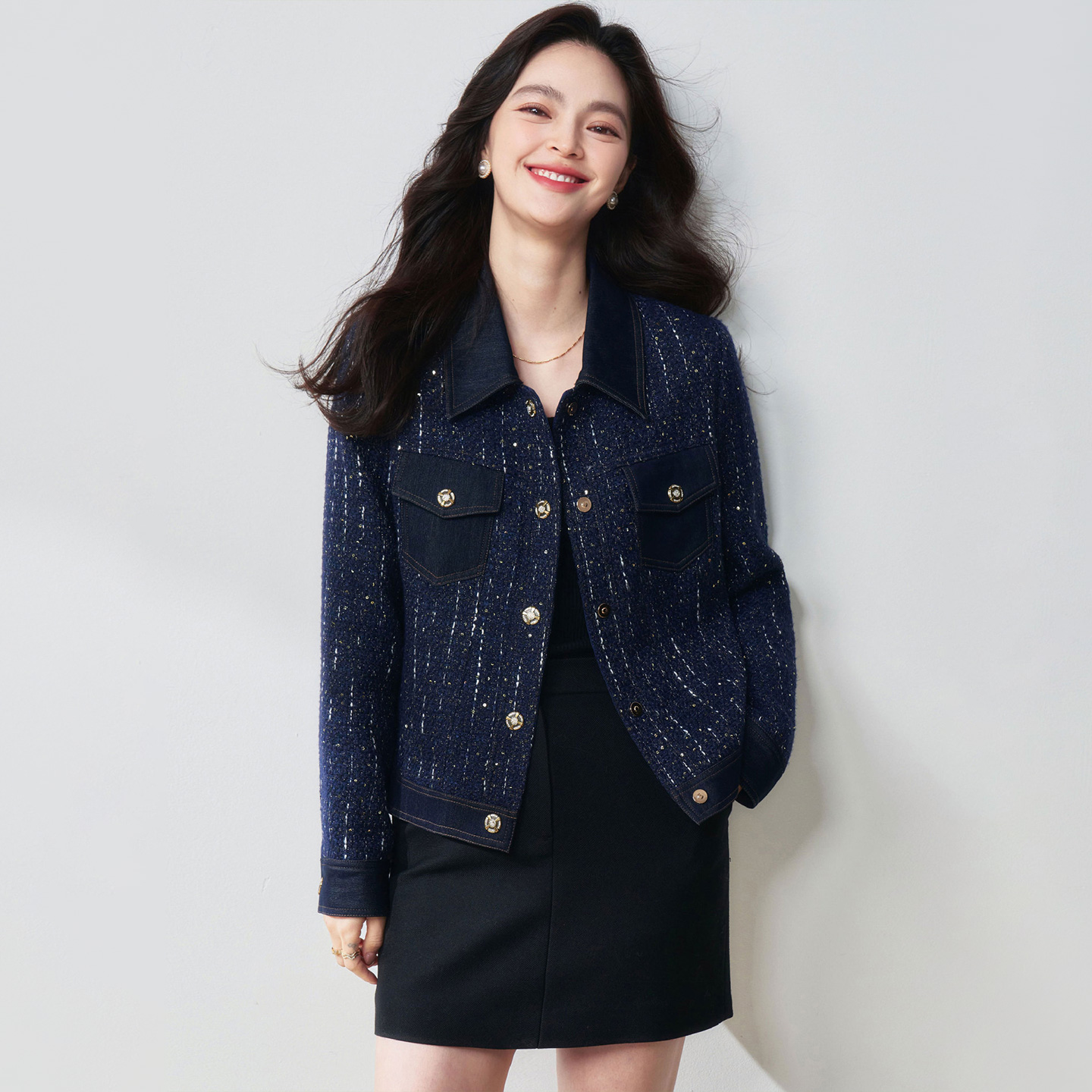 2025年25春蓝调夜色时尚 气质牛仔拼接藏蓝花纱亮片小香风翻领外套