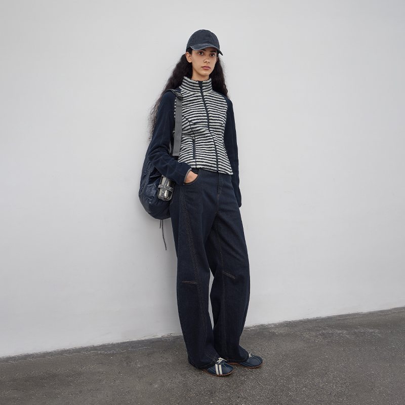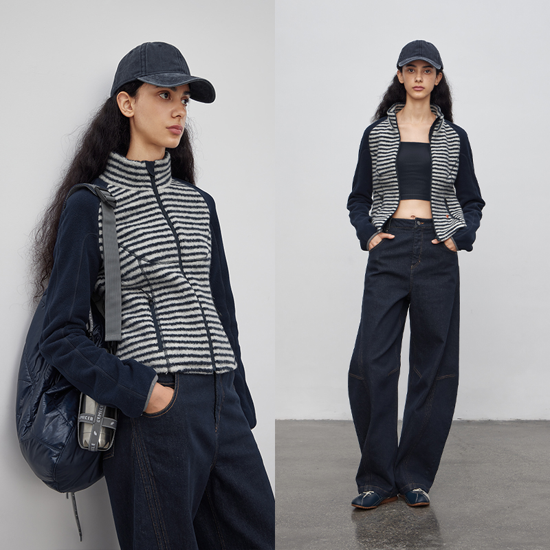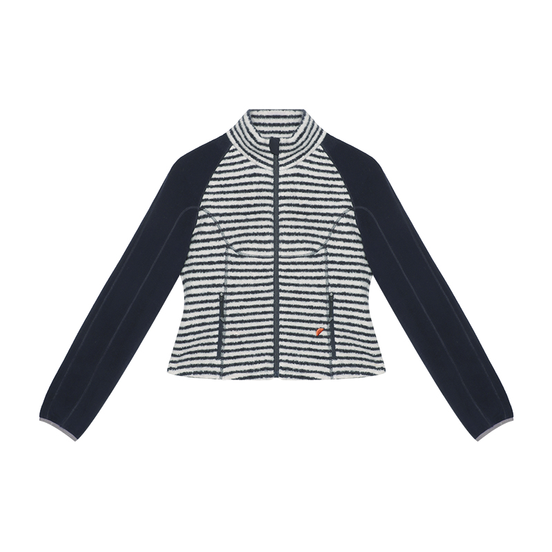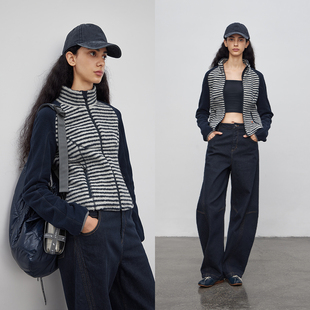 立领藏青条纹拼接修身 2025秋季 休闲外套女 运动 半圆原创设计女装