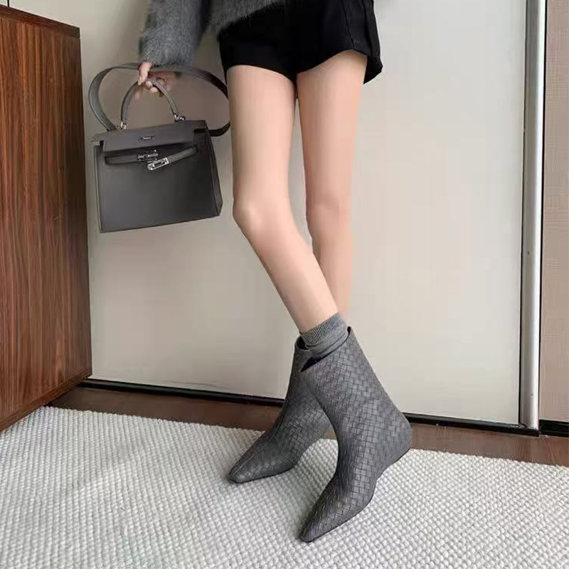2025秋冬新款 百搭方头短靴女 编织宽松洋气套筒坡跟直筒中筒靴时尚