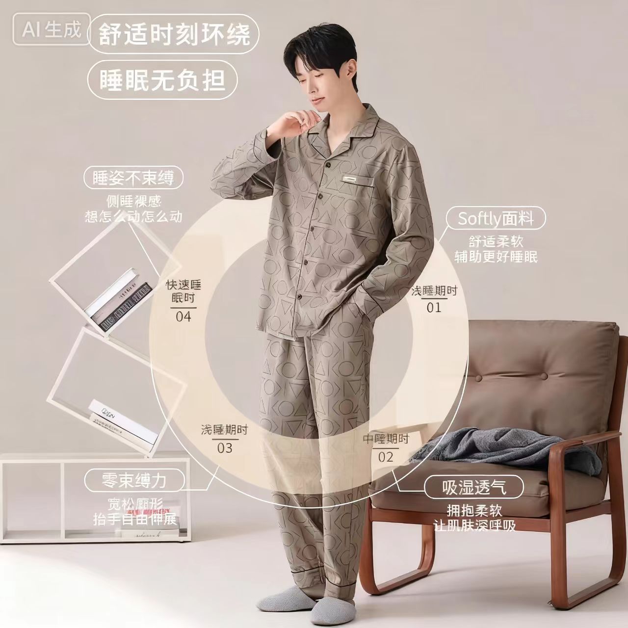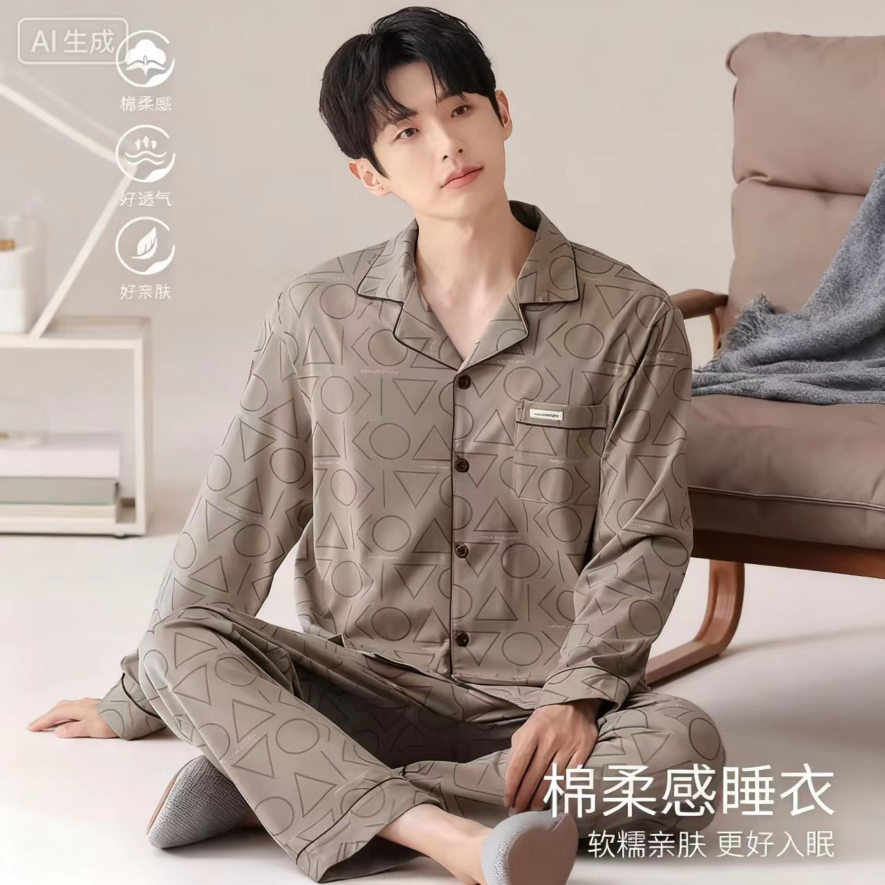 开衫 春秋季 长袖 套装 全棉高级感可外穿家居服 长裤 猫人纯棉睡衣男款
