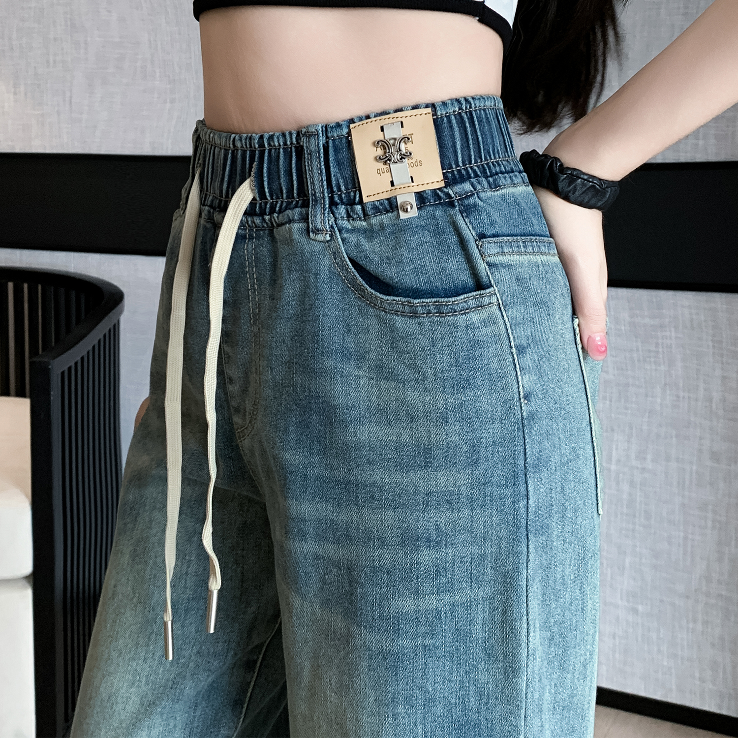 脚微喇拖地裤 高腰阔腿牛仔裤 深蓝色宽松显瘦遮胯大裤 新款 女春秋季