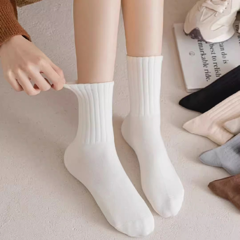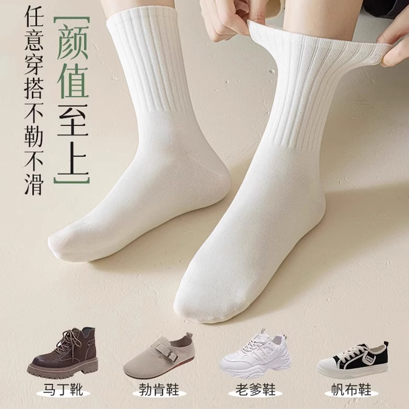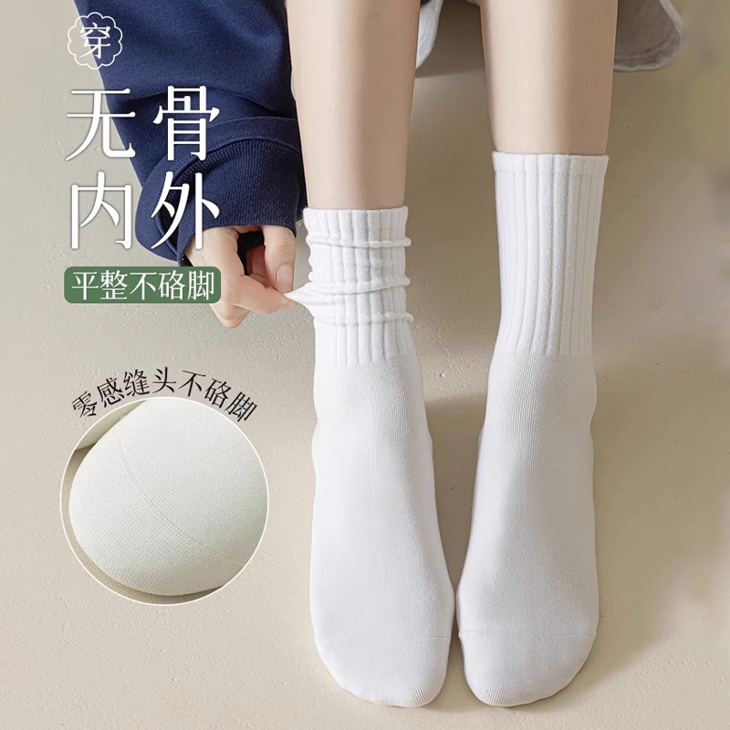 白色堆堆袜子女春秋季 全棉无骨中筒袜纯棉防臭长袜吸汗透气运动袜