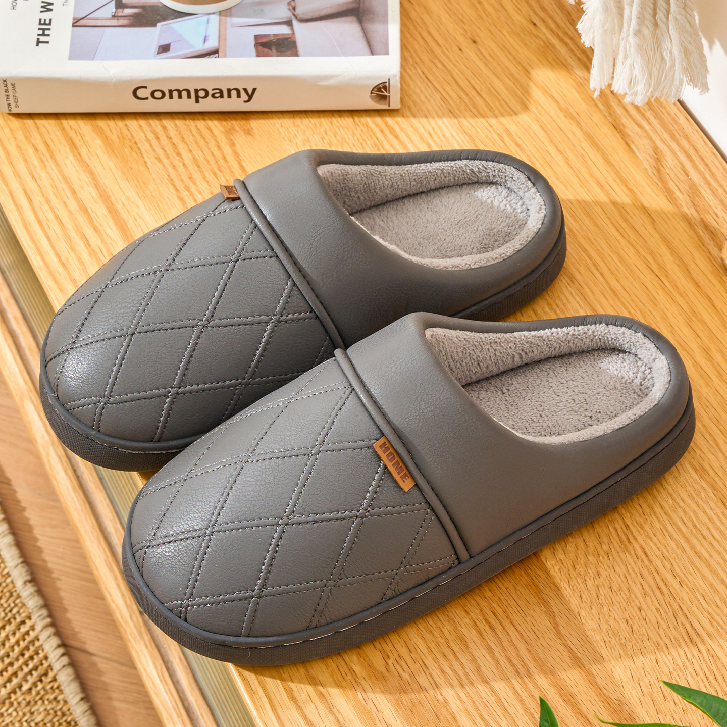 男士 防水棉拖鞋 防滑保暖pu黑色加绒老人棉鞋 室内家居2025新款 男款
