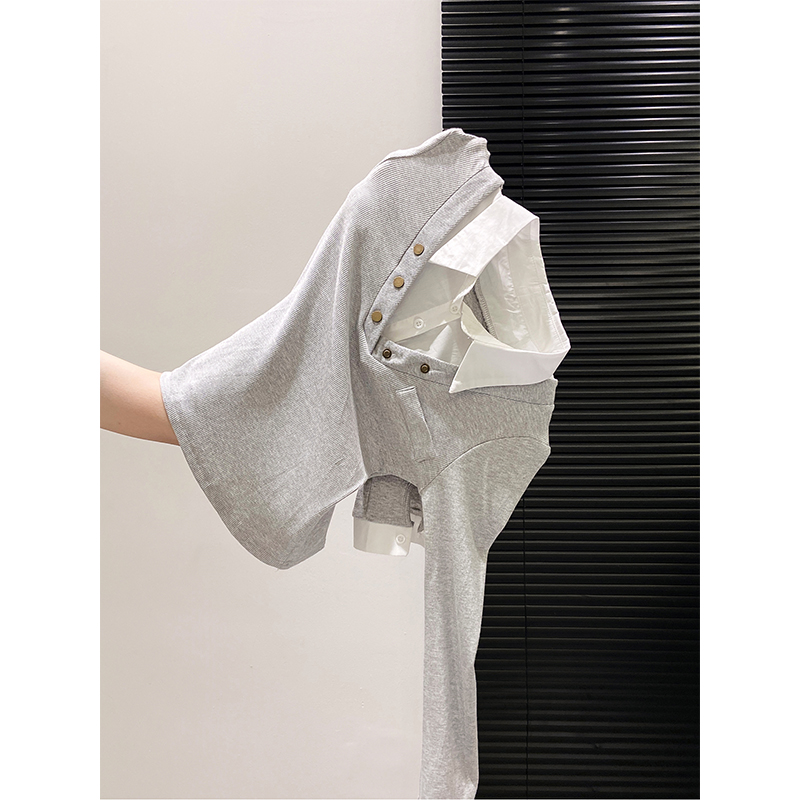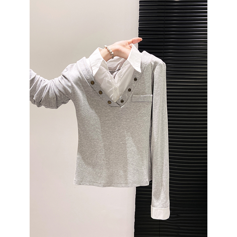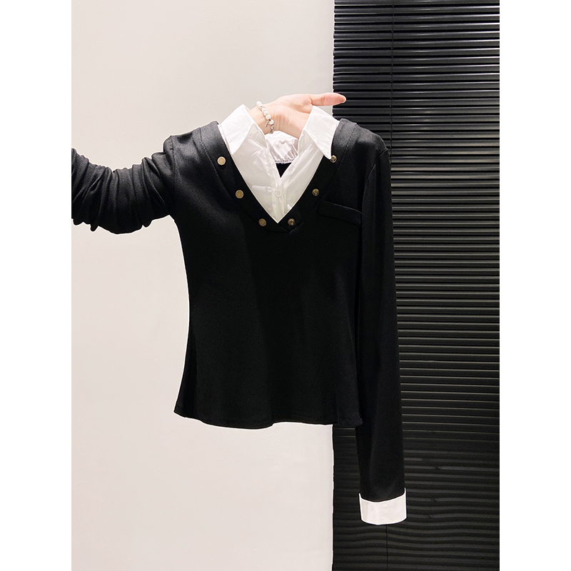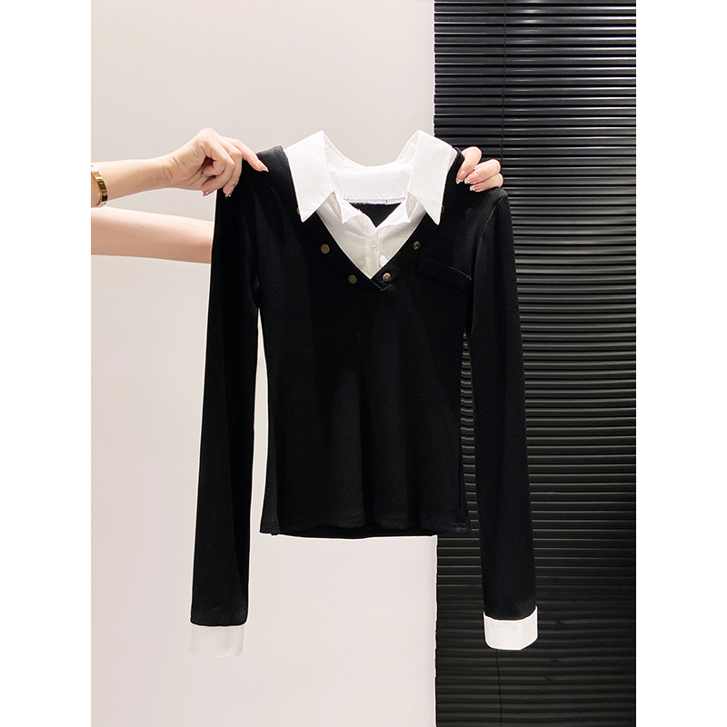 显瘦短款 修身 正肩小上衣 t恤女2025早秋新款 假两件拼接POLO领长袖