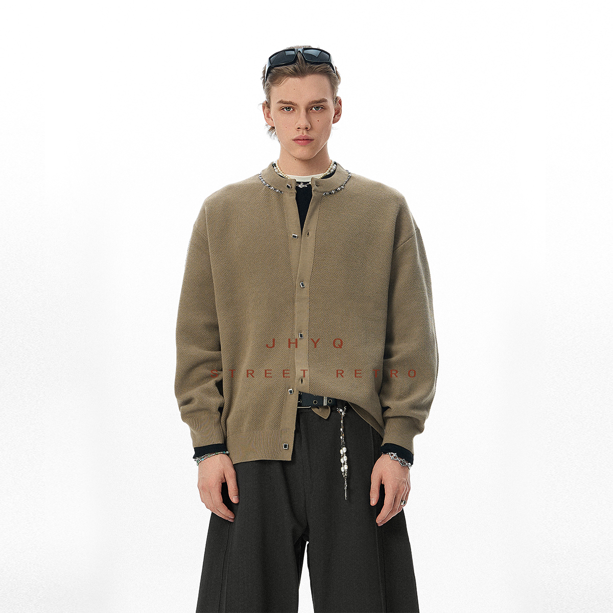 翻领毛衣高级感外套 男秋季 JHYQ美式 复领口设计银链拼接针织开衫