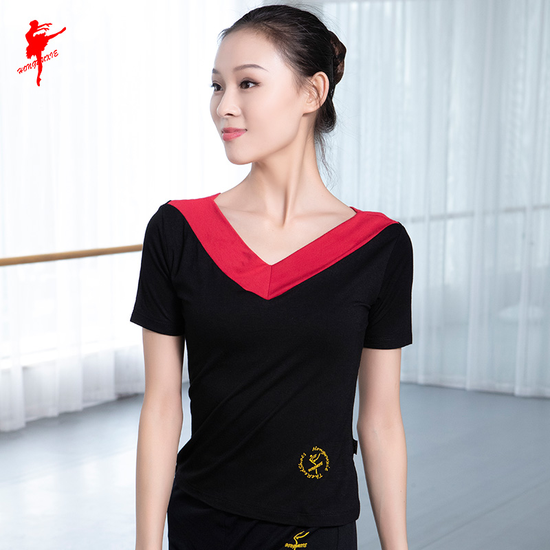 舞蹈练功上衣健身服广场舞T恤健美操舞蹈服3506 V领短袖 红舞鞋 女式