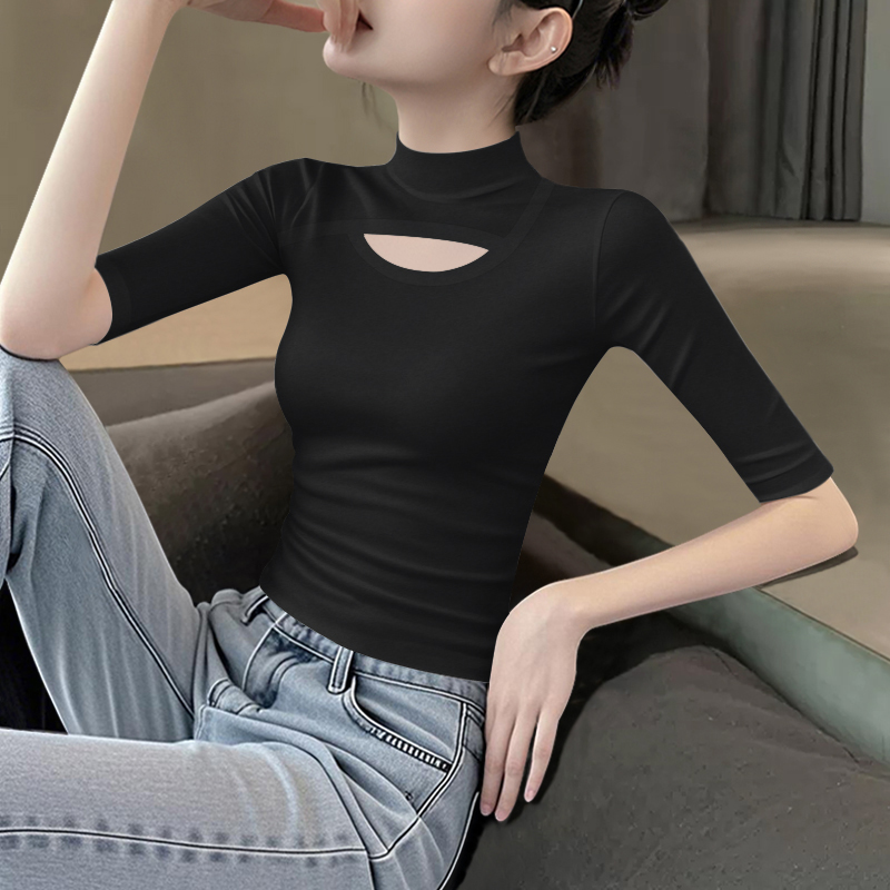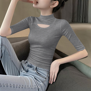 紧身上衣服 T恤女半高领正肩针织五分袖 2025新款 早秋咖色镂空中袖