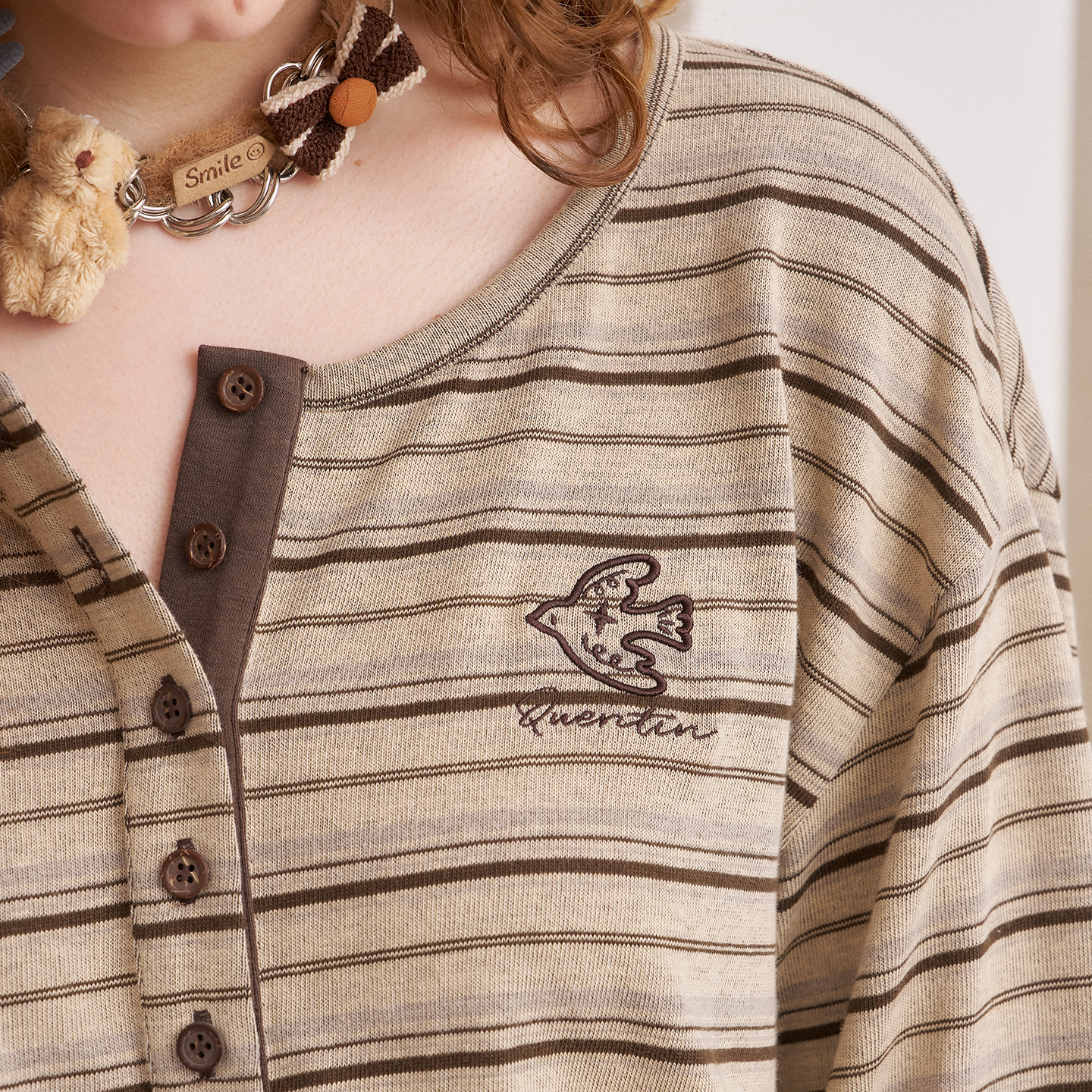 打底衫 T恤polo衫 秋冬 复古棕色条纹宽松圆领刺绣长袖 DIDDIMODA