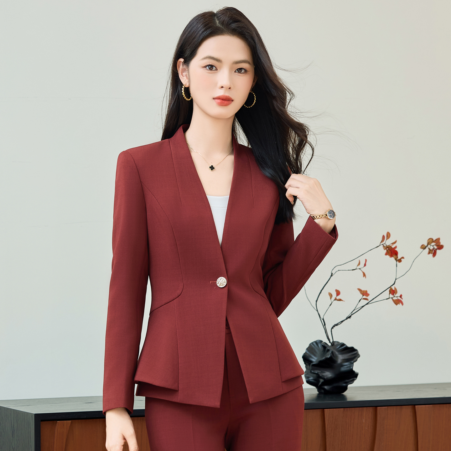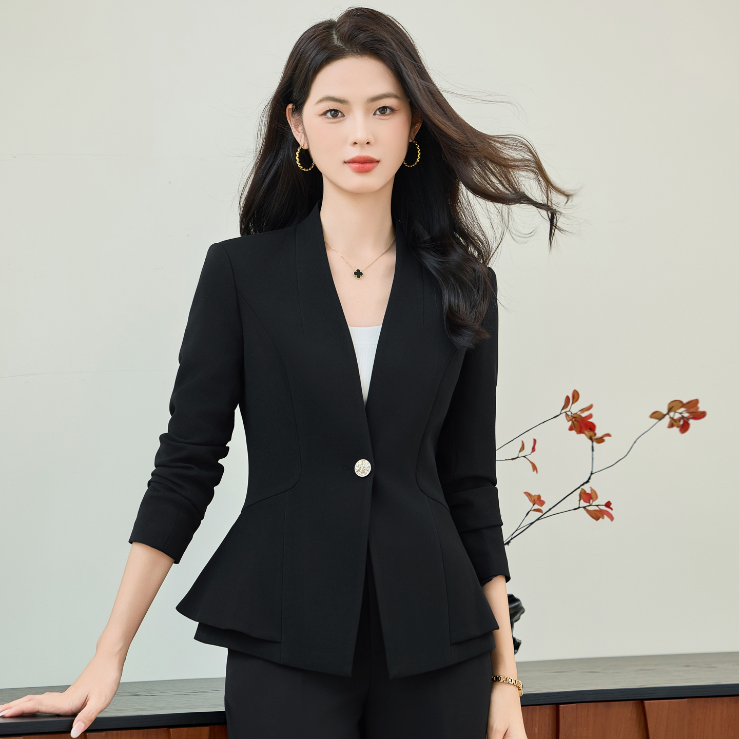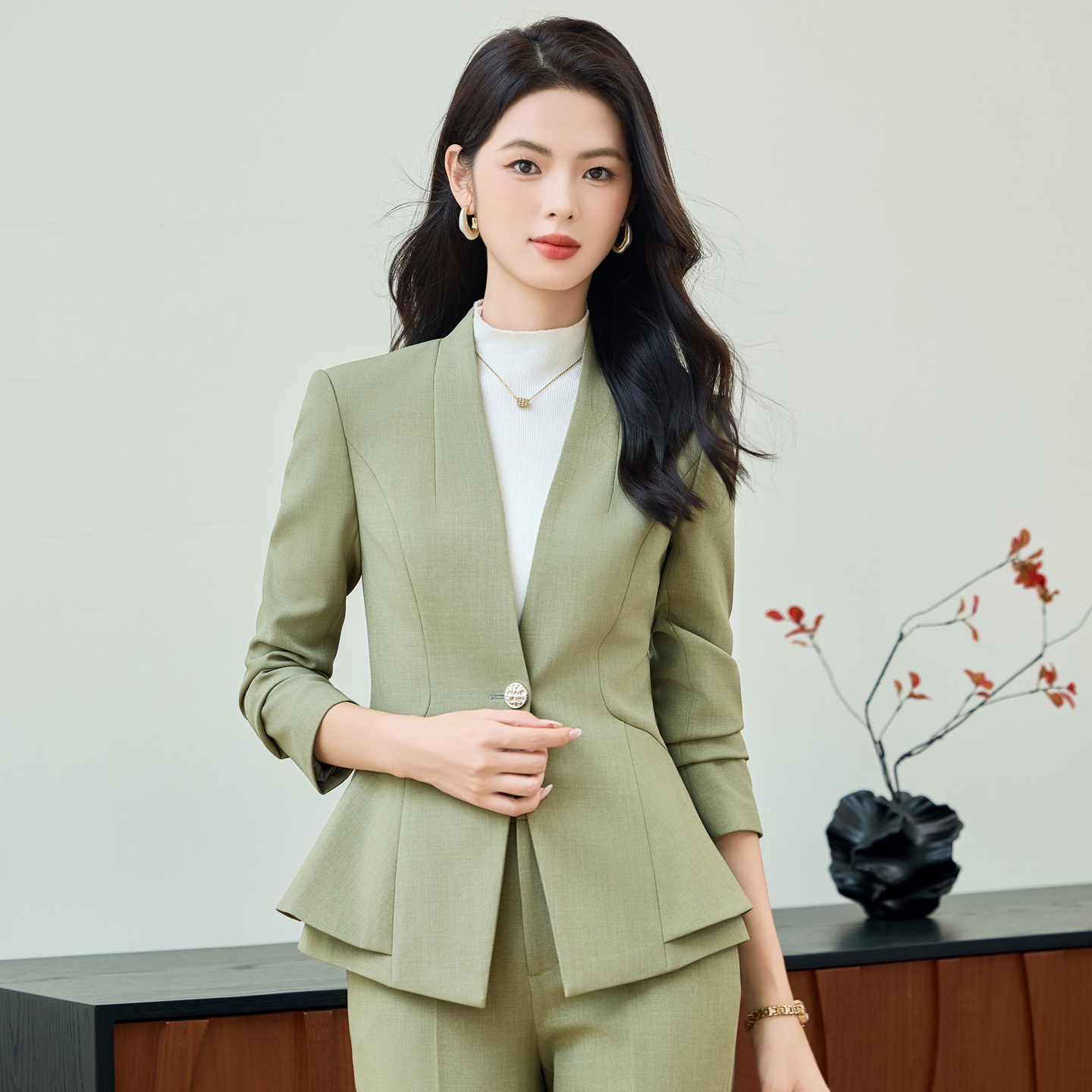 2025秋新款 套装 医美前台工作服 外套微喇西裤 荷叶边浅绿色无领西装