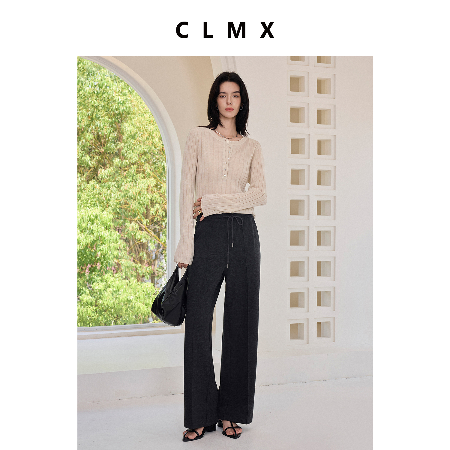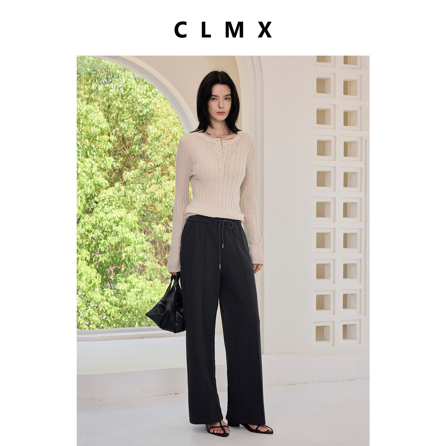 CLMX轻盈细针羊毛纱线纽扣针织衫 竖条亨利领上衣女 简约修身