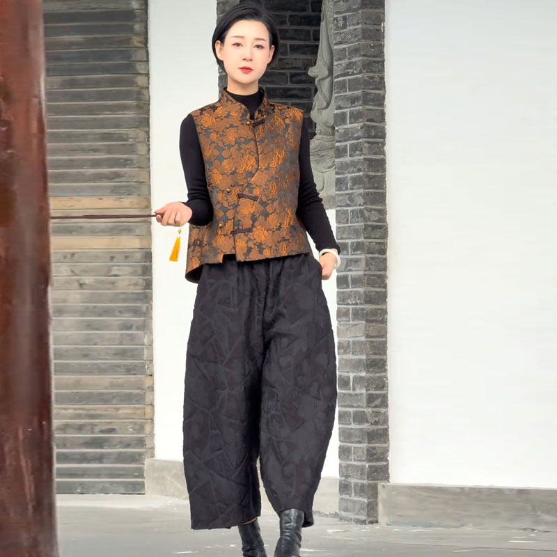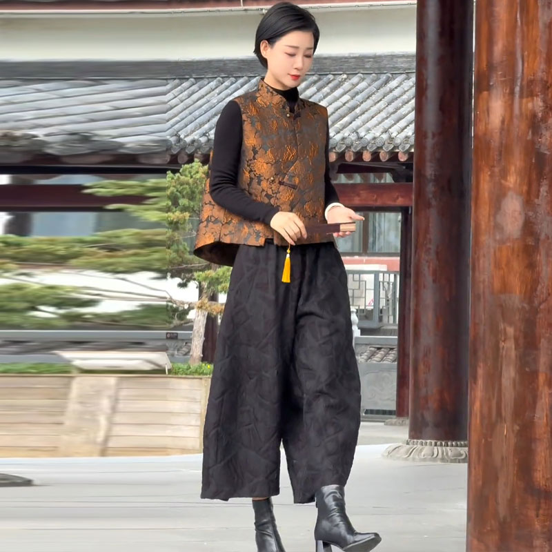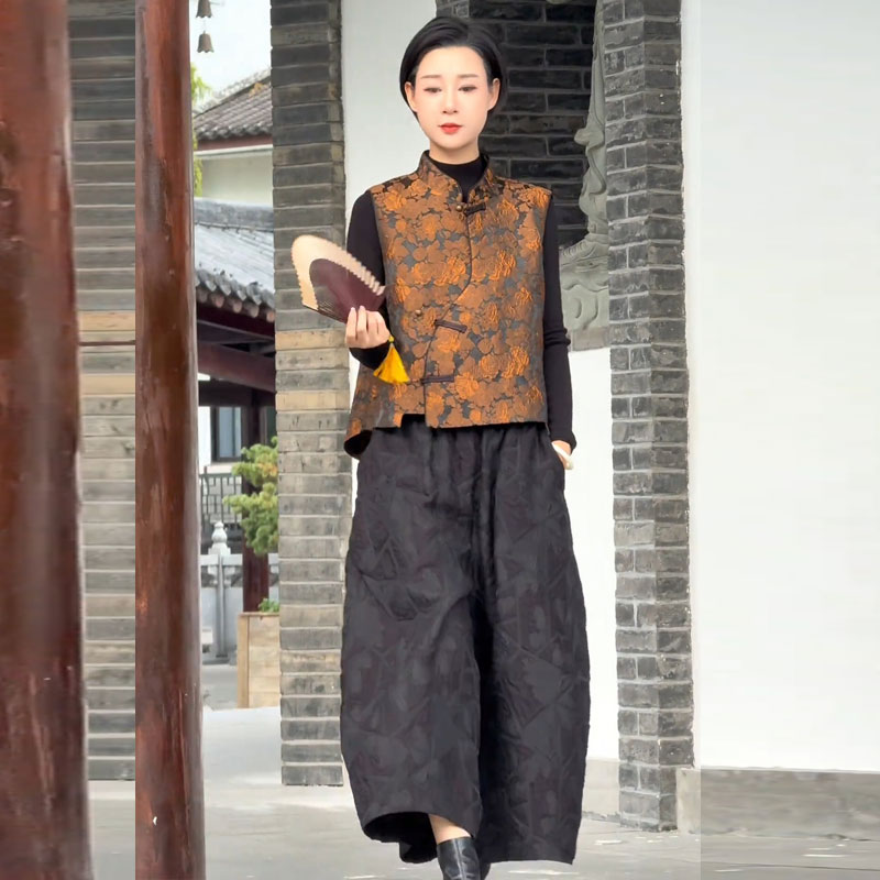 两件套装 中式 花苞阔腿裤 女2025秋提花云缎外搭坎肩 复古马甲套装