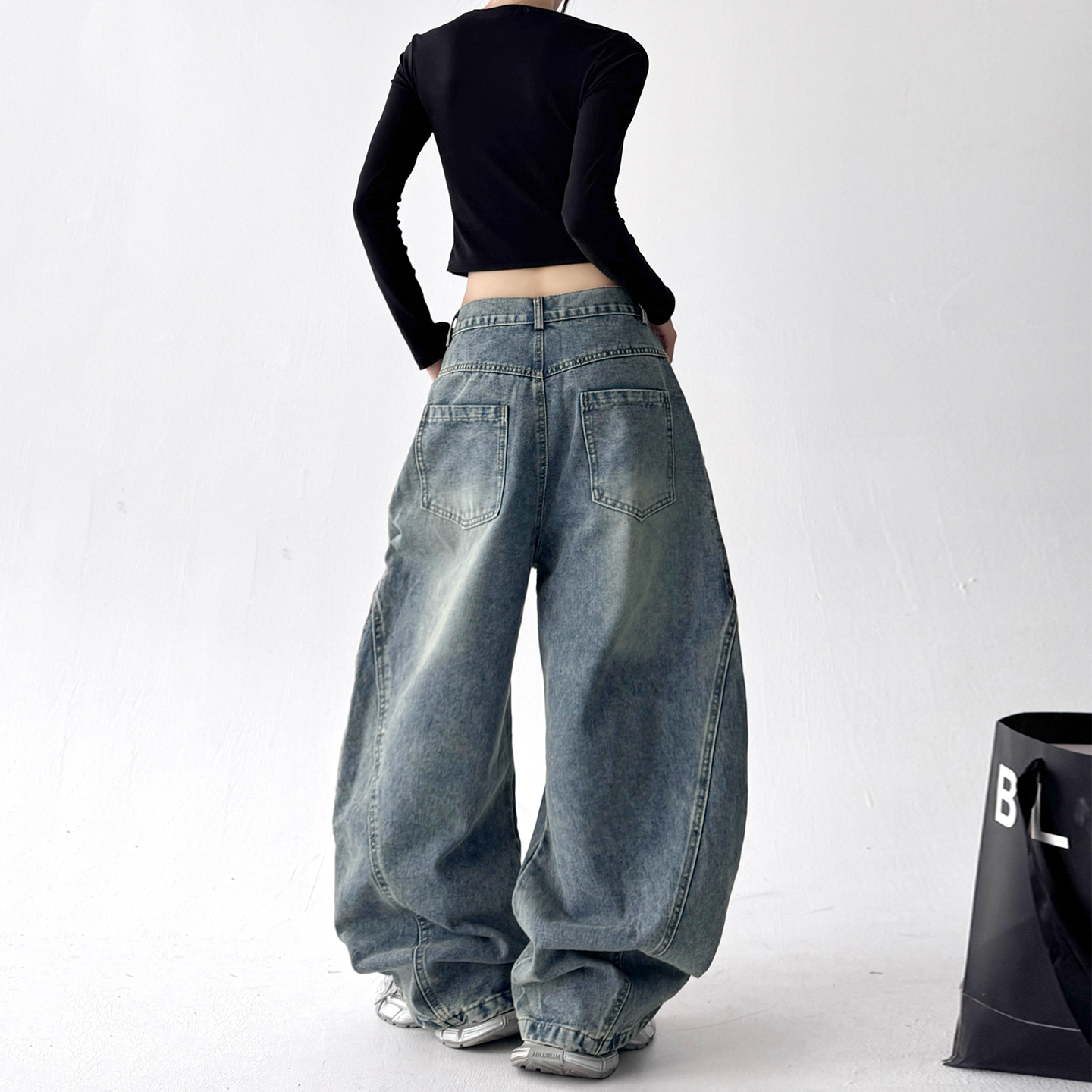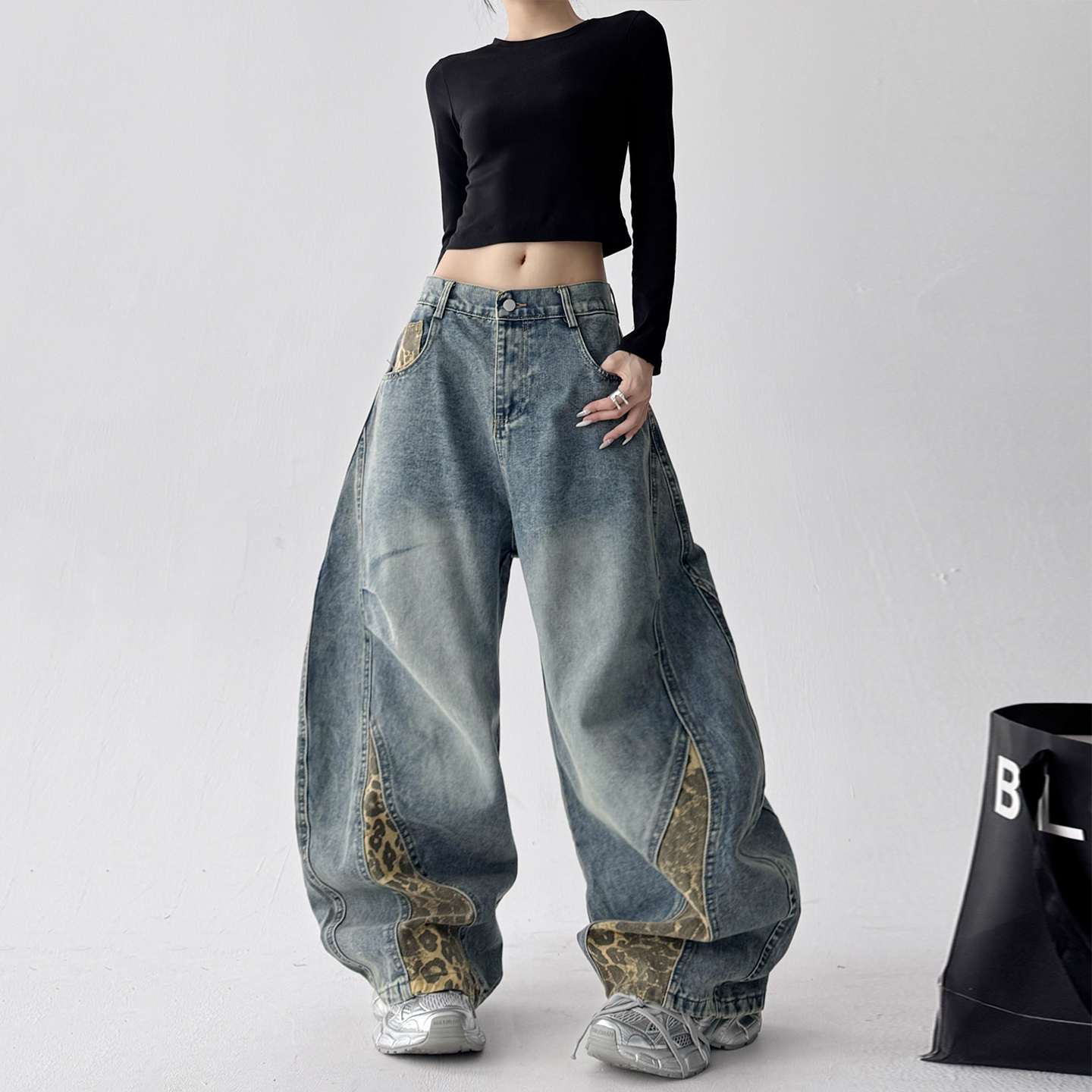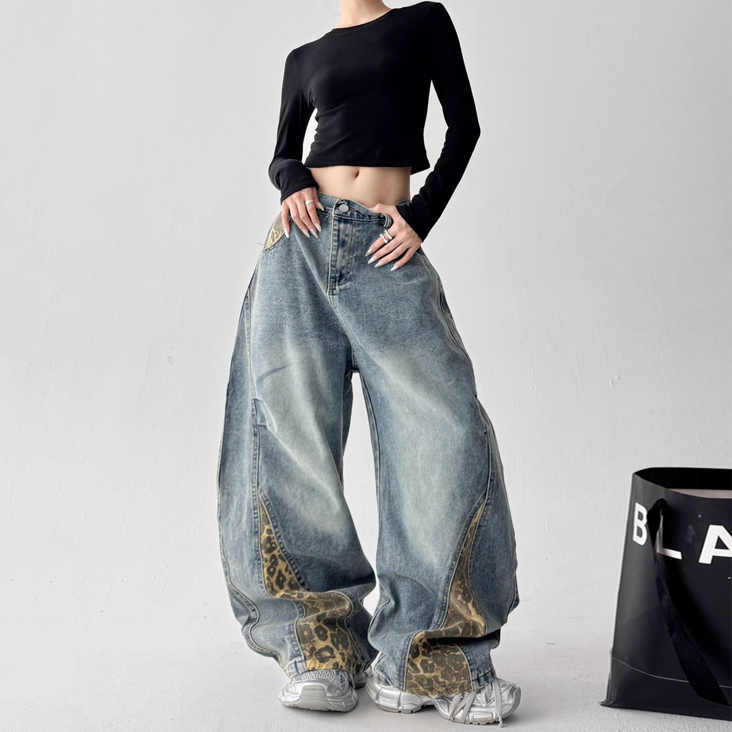 高街vibe宽松休闲阔腿裤 美式 新款 女2025秋季 复古豹纹拼接牛仔裤