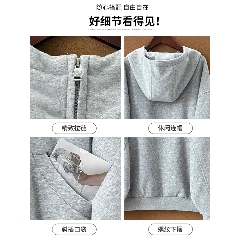 开衫 爆款 拉链上衣休闲宽松显瘦外套 2025新款 灰色连帽卫衣女早秋季