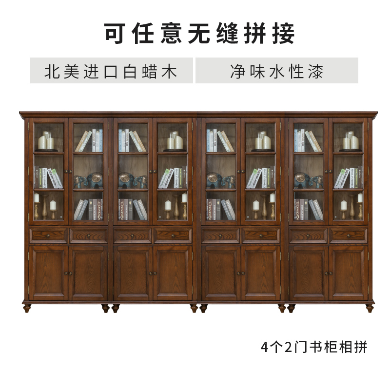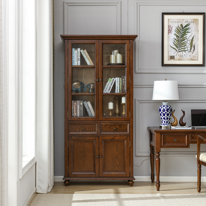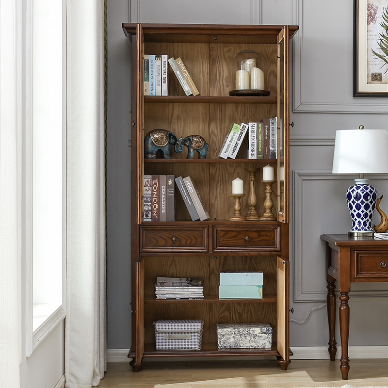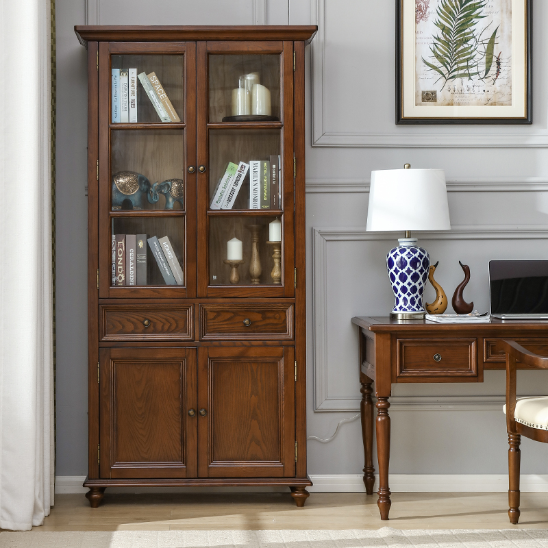实木书柜家用客厅展示柜可定制柜子中古风带玻璃门单个书柜储物柜