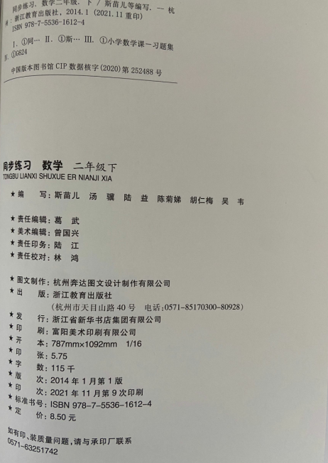 课本配套浙江教育出版 小学数学同步练习二年级下册R人教版 社小学生2年级下册数学同步练习浙江省含部分参考答案 代购 正版