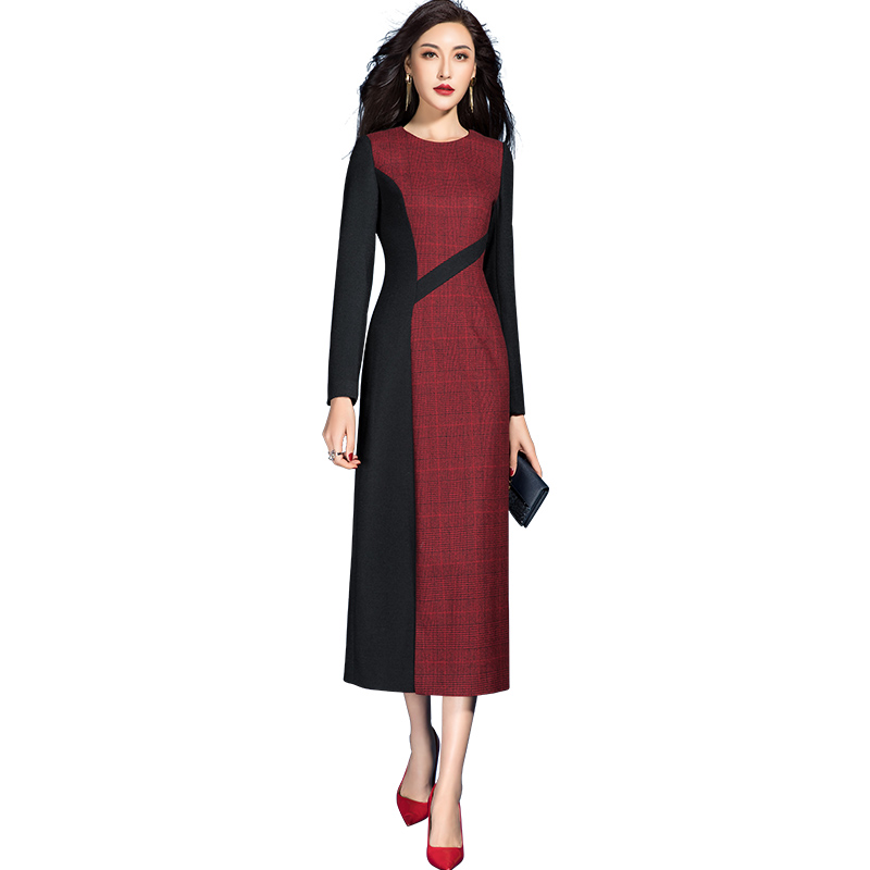 修身 2025年新款 显瘦红色拼接包臀裙子女 女装 品牌毛呢连衣裙秋冬款