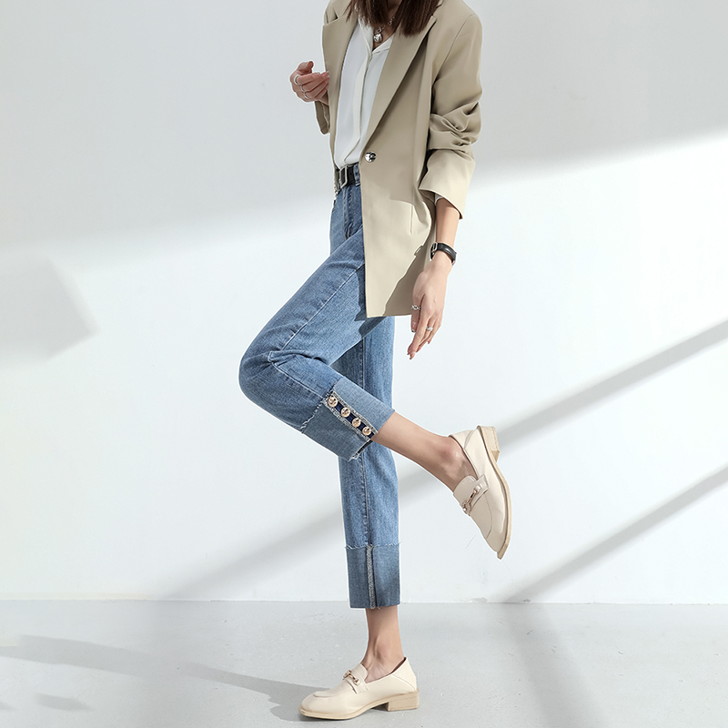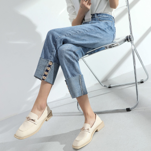 子高腰显瘦九分烟管裤 卷边牛仔裤 女直筒宽松浅色春秋小个子八分裤