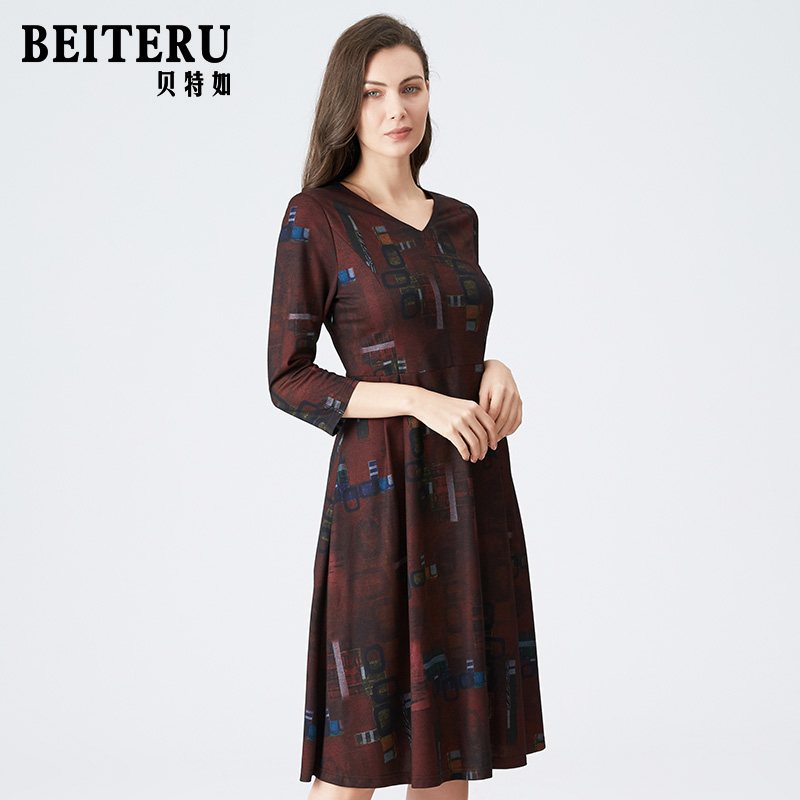 秋季 A字裙子专柜正品 新款 中长款 连衣裙V领复古修身 贝特如妈妈装