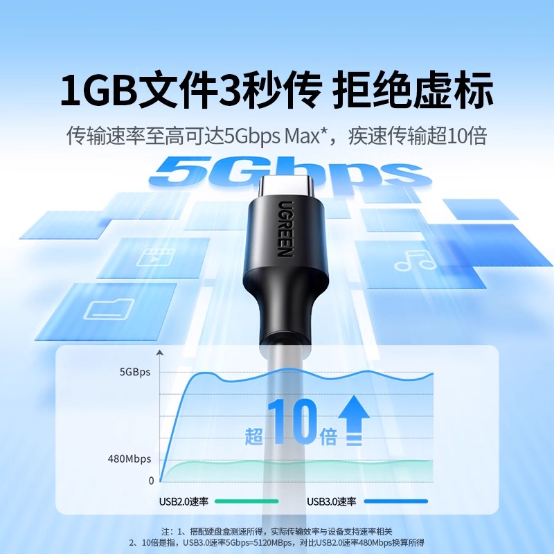 绿联usb3.0转type c数据线接高速移动硬盘盒iPad电脑数据传输Air4刷机Pro适用于安卓手机通用快充线短
