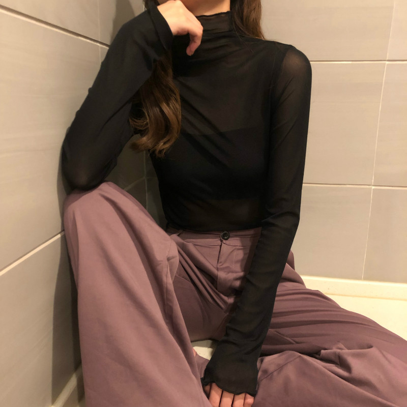 好搭配单品轻薄半透花边小高领打底衫 韩国秋季 新款