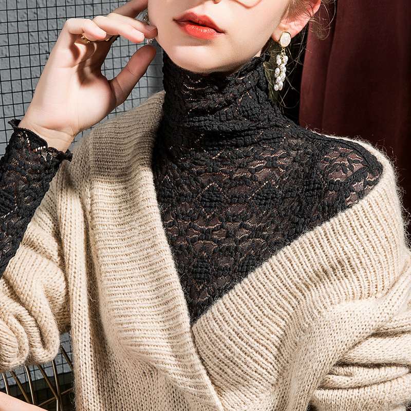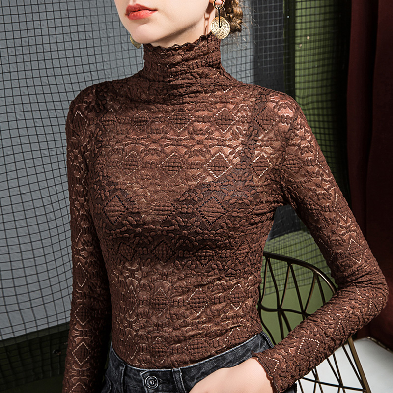 高领蕾丝打底衫 小衫 女修身 洋气网纱长袖 T恤堆堆领女装 2025秋季