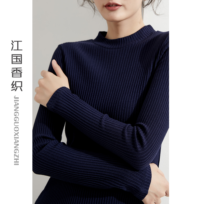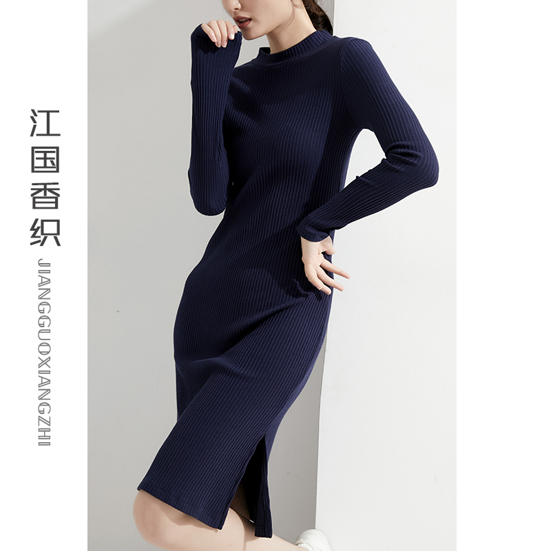 针织连衣裙 薄款 秋季 长裙中长款 打底开叉毛衣裙子 半高领修身 长袖