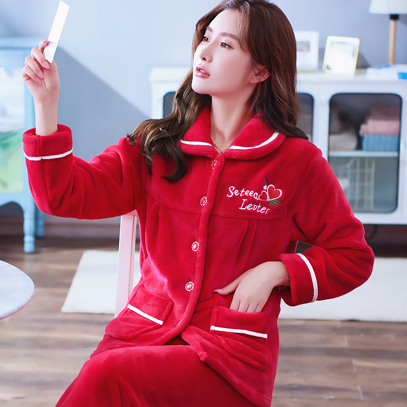 大码 春秋开衫 女士家居服 加厚珊瑚绒睡衣女冬法兰绒加绒套装 秋冬季