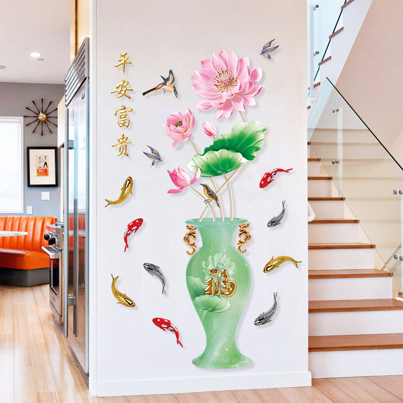中国风3D立体莲花墙贴纸卧室床头沙发电视背景贴画房间门自粘墙纸