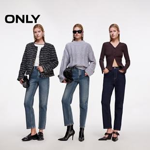 女 做旧复古皮牌斜插高腰松弛显瘦宽松直筒牛仔裤 ONLY2025秋季 新款