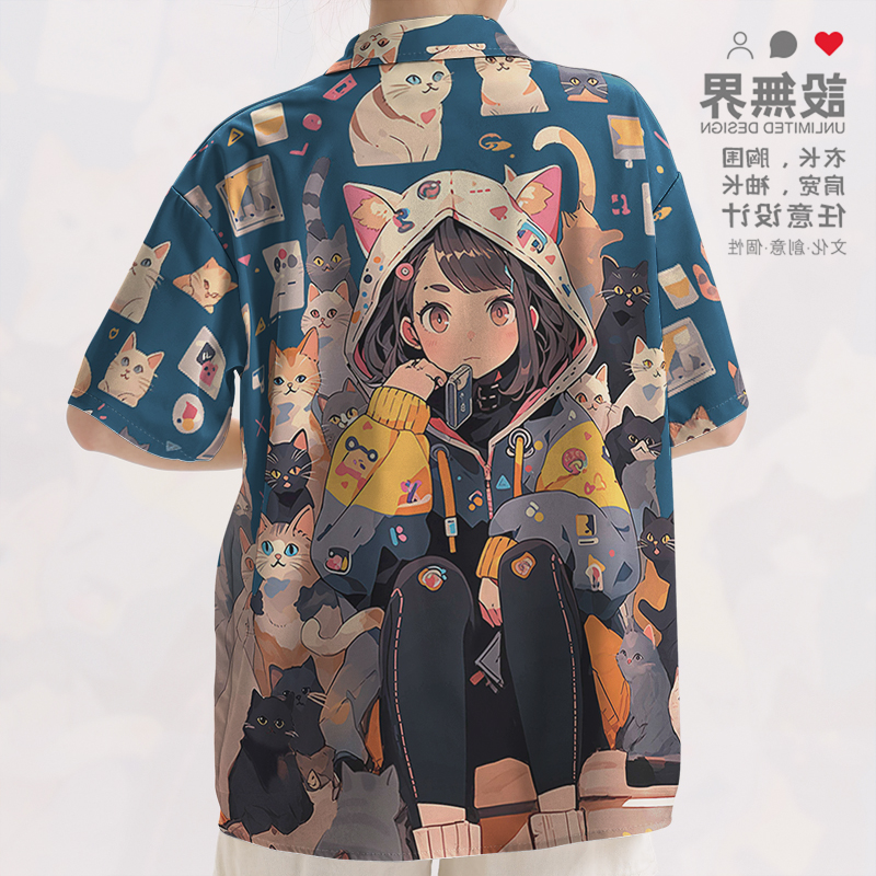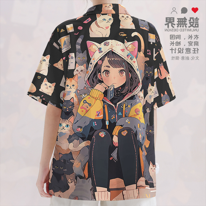 短袖 0018设 衬衫 女装 无界 男装 拼贴猫咪街头潮酷女孩卡通图案大码
