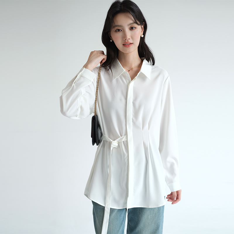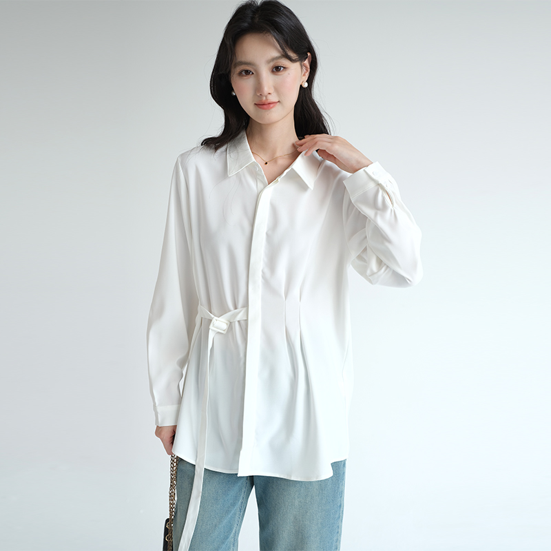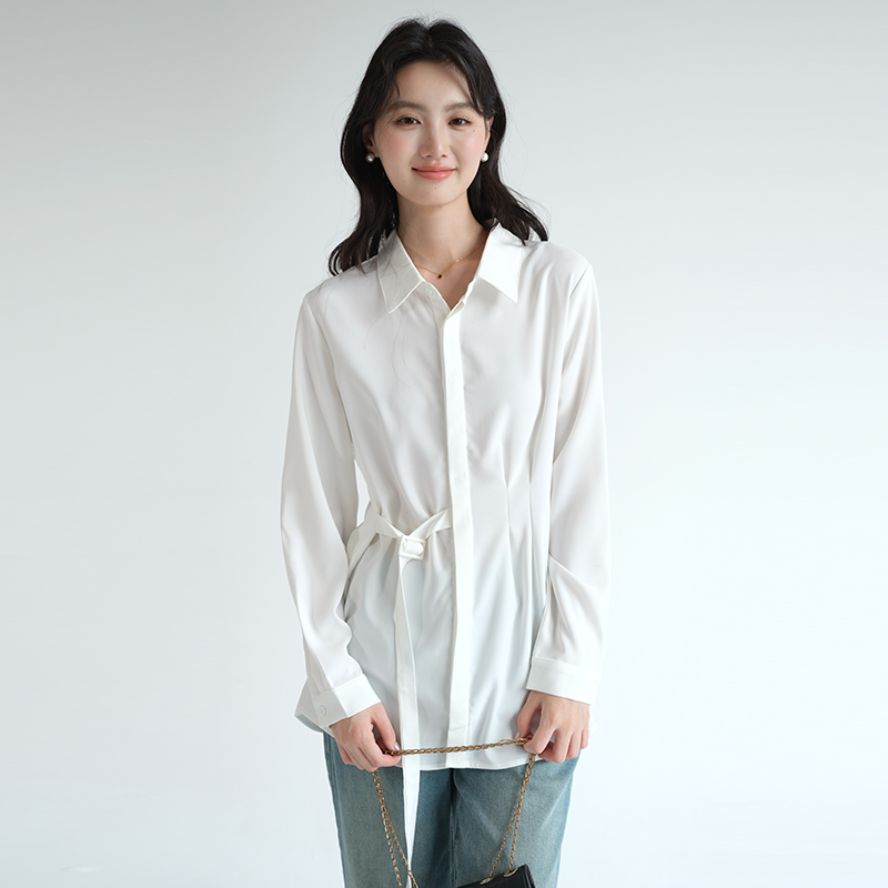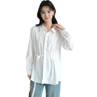 宽松显瘦长款 2025秋新款 蓝若水大码 OL衬衫 极简垂感系带白衬衣