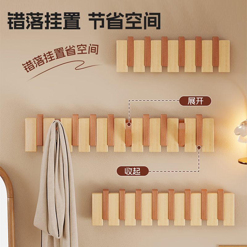 钢琴键挂衣架入户玄关门后置物墙上衣帽钩免打孔实木壁挂收纳挂钩